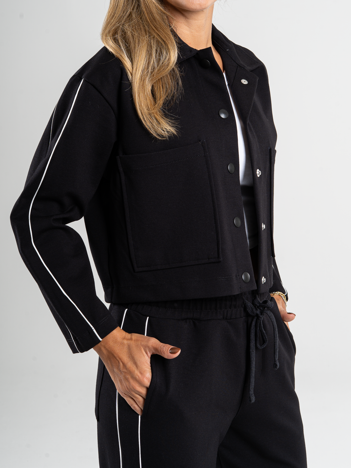 Chaqueta con stretch, vivos en mangas, cuello camisero, bolsillos delanteros, tono negro