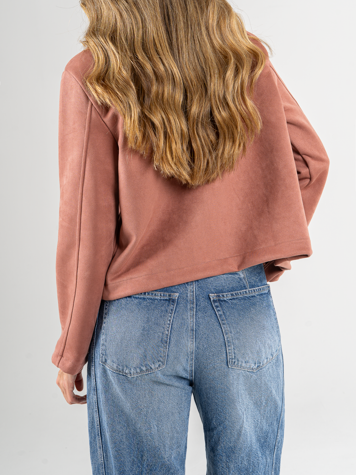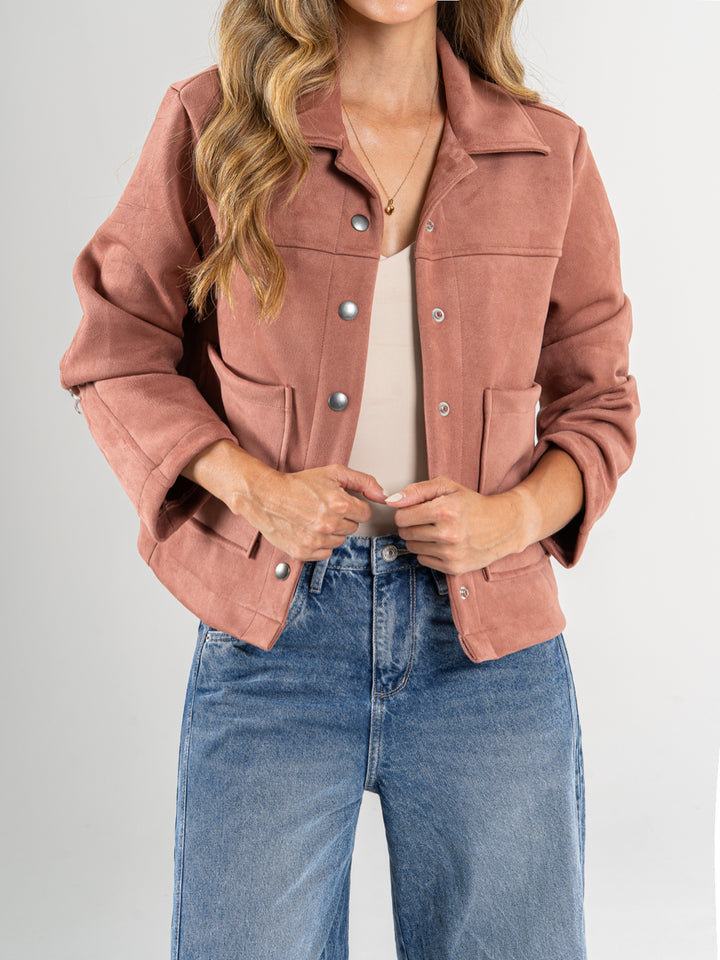 Chaqueta efecto piel, tacto suave, cuello con solapa, tono terracota, bolsillos y botones delanteros