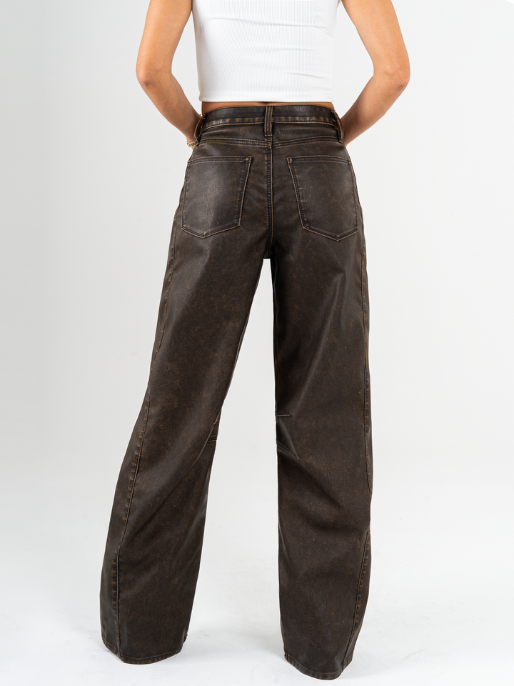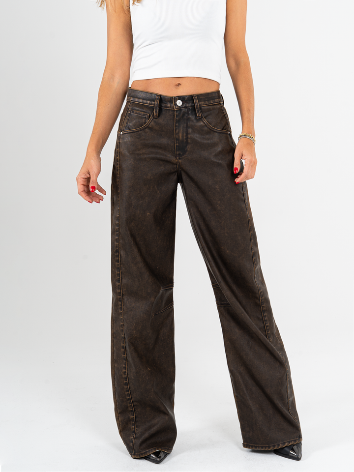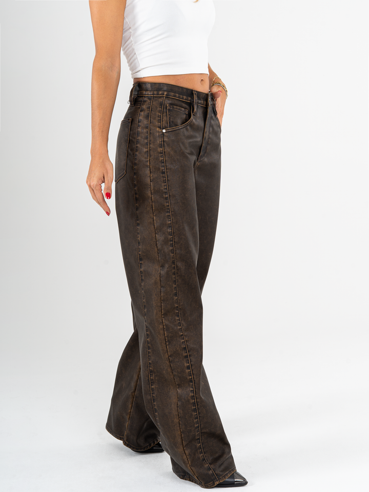 Pantalón wide leg, rígido, tiro alto, diseño cinco bolsillos, con cortes, tipo cuero, tono cafe, diseño cinco bolsillos, silueta amplia