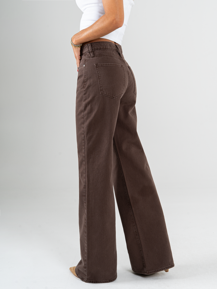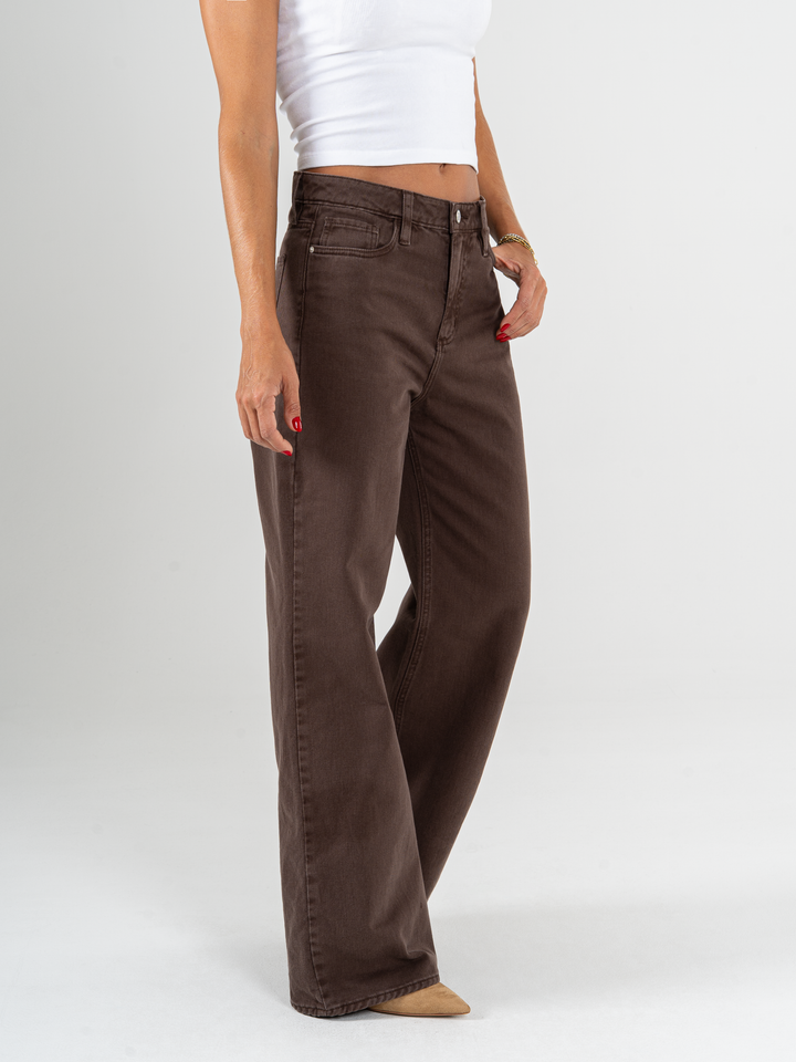 Pantalón mom flare, rígido, tiro alto, cafe, cintura ajustada, pierna holgada, diseño cinco bolsillos.
