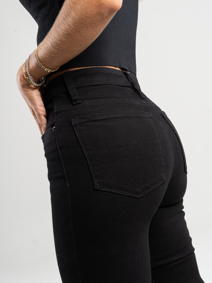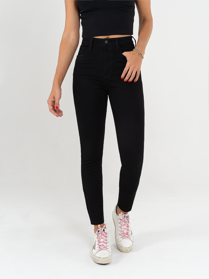 Jean skinny stretch, tiro alto, tono negro, diseño cinco bolsillos y pierna ajustada.