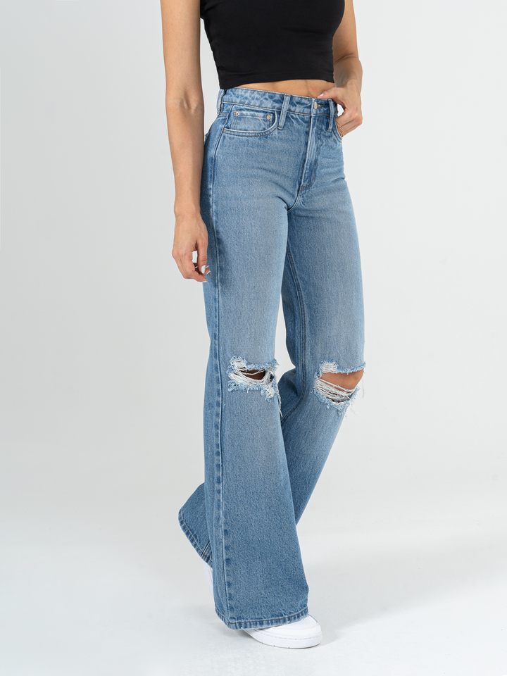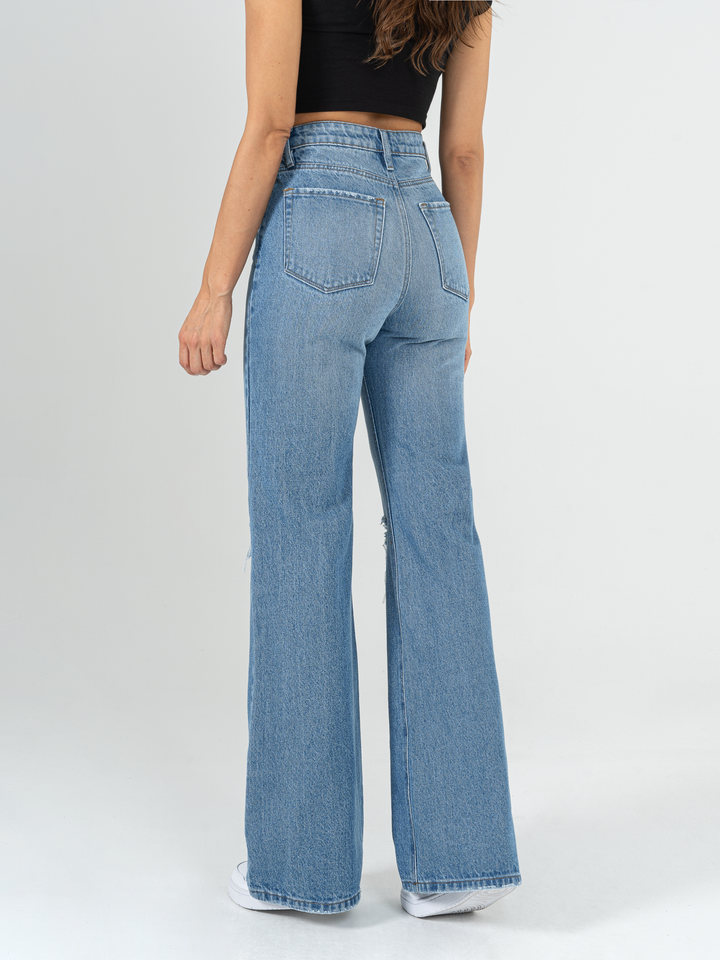 Jean Mom Flare, rígido, tiro alto, tono azul medio con rotos, diseño cinco bolsillos, cintura ajustada, pierna holgada.