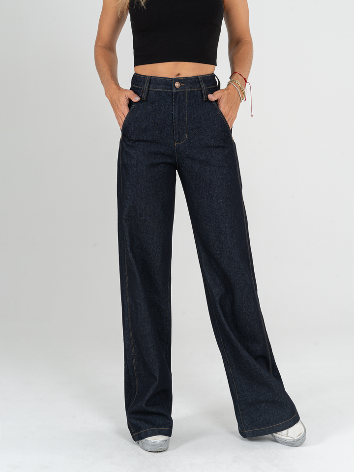 Ref: 065355 Jean palazzo, rígido, tiro alto, tono azul oscuro, cintura con elástico, y detalle en pretina