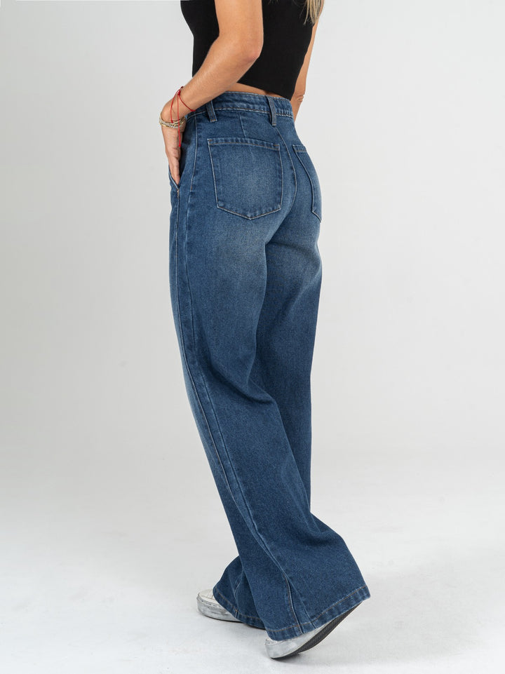 Ref: 065355 Jean palazzo, rígido, tiro alto, tono azul oscuro, cintura con elástico, y detalle en pretina