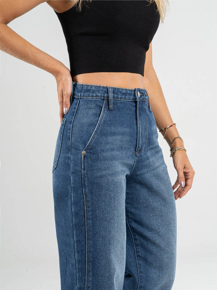 Jean Mom Flare, rígido, cortes en pierna, tiro alto, tono azul medio oscuro, cintura ajustada y pierna holgada.