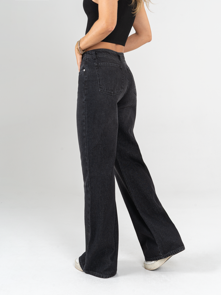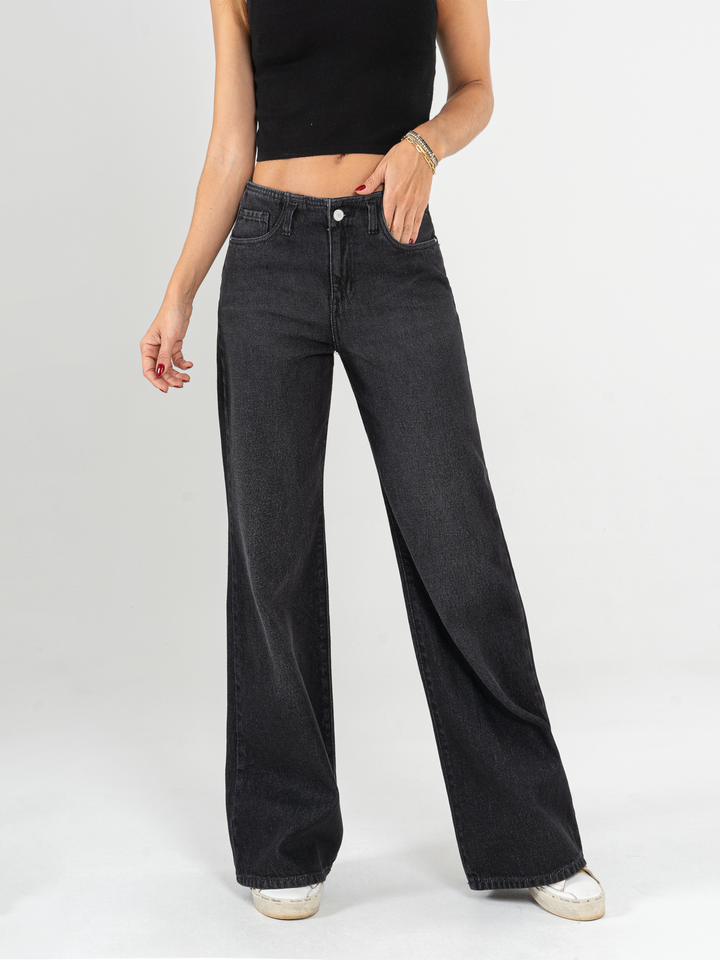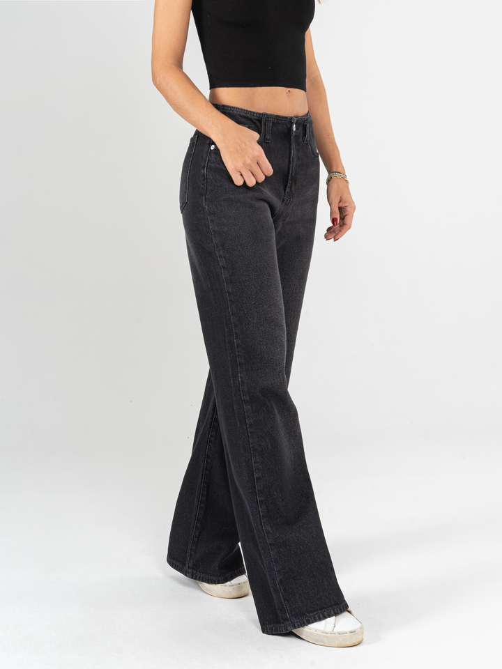 Jean palazzo, rígido, tiro alto, tono gris oscuro, detalle en cintura, cintura ajustada pierna holgada, diseño cinco bolsillos.
