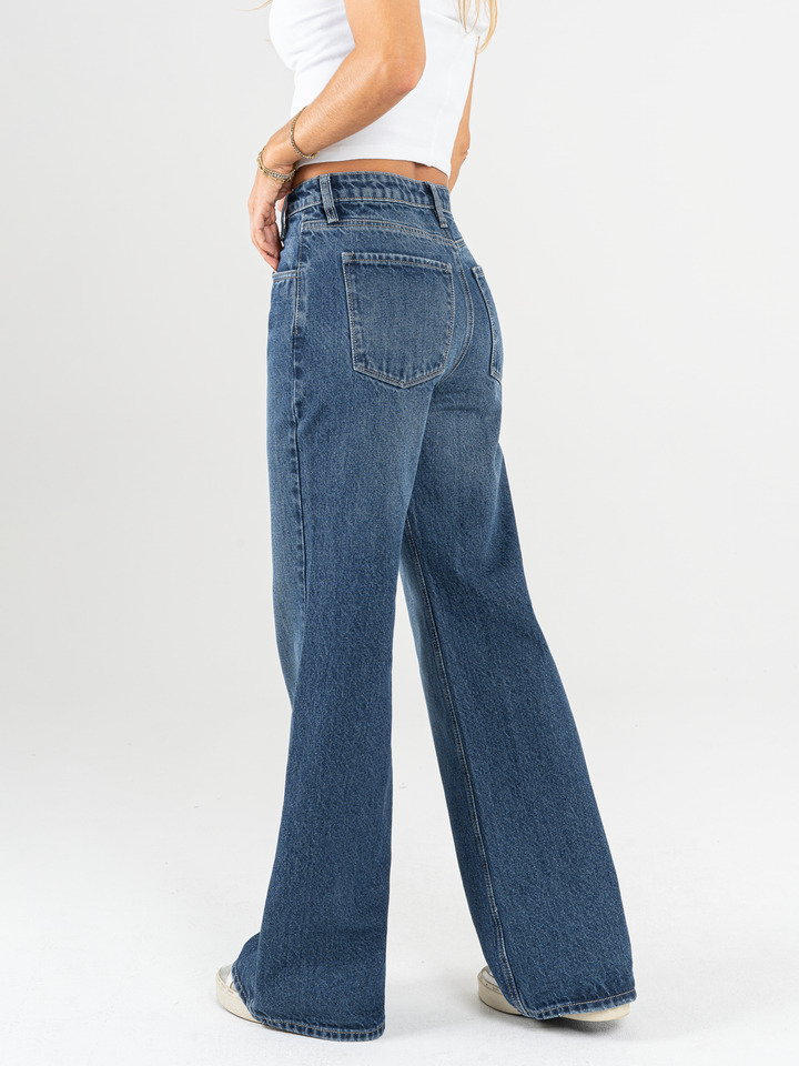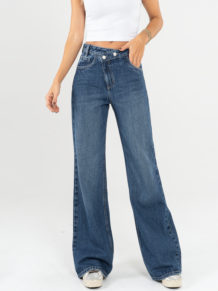 Jean Mom flare, rígido, tiro alto, tono azul oscuro, detalle en cintura, cintura ajustada pierna holgada, diseño cinco bolsillos.