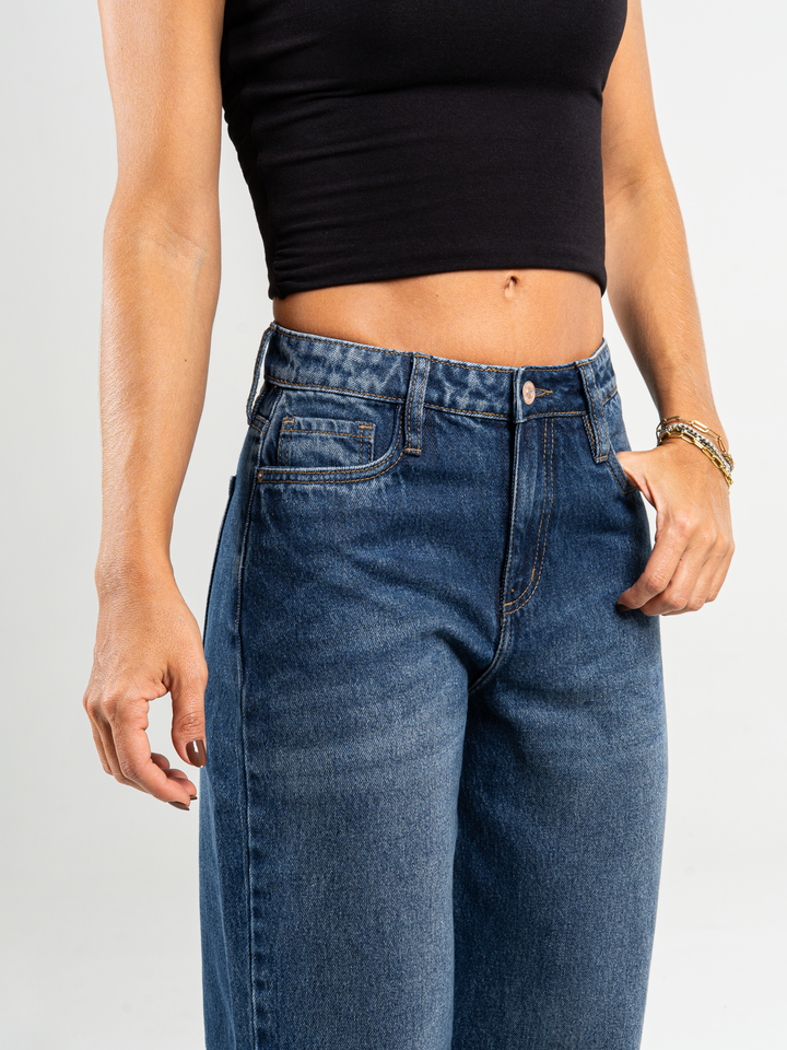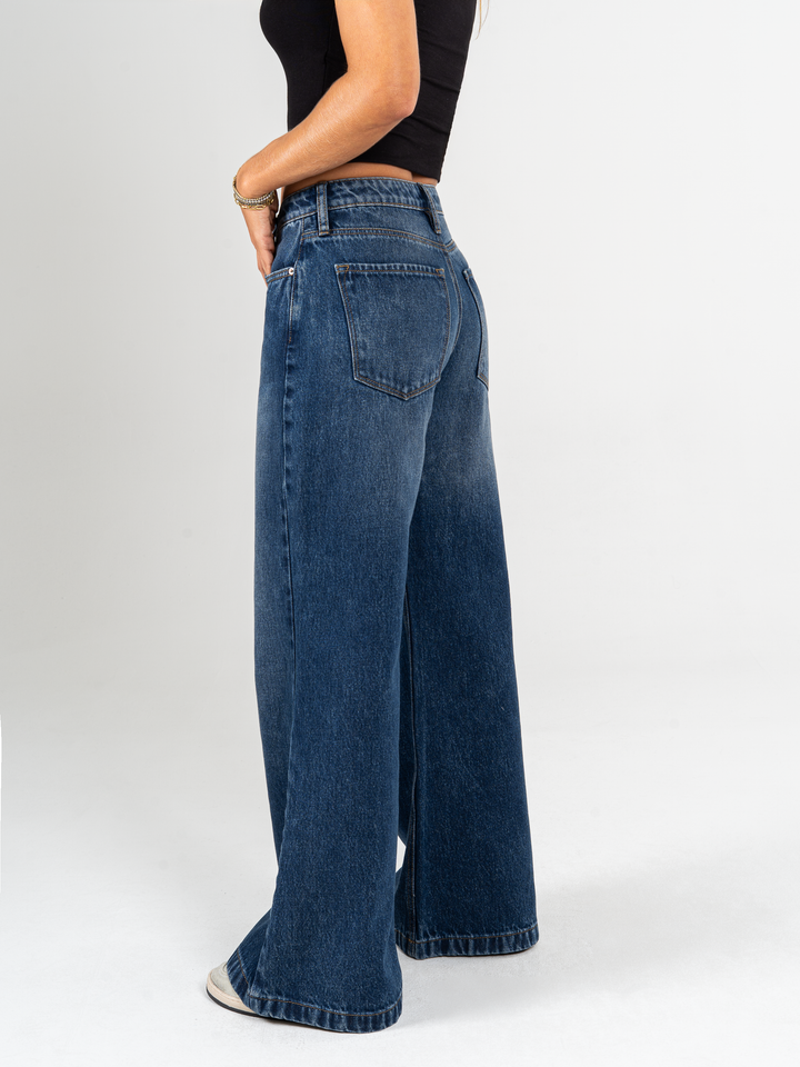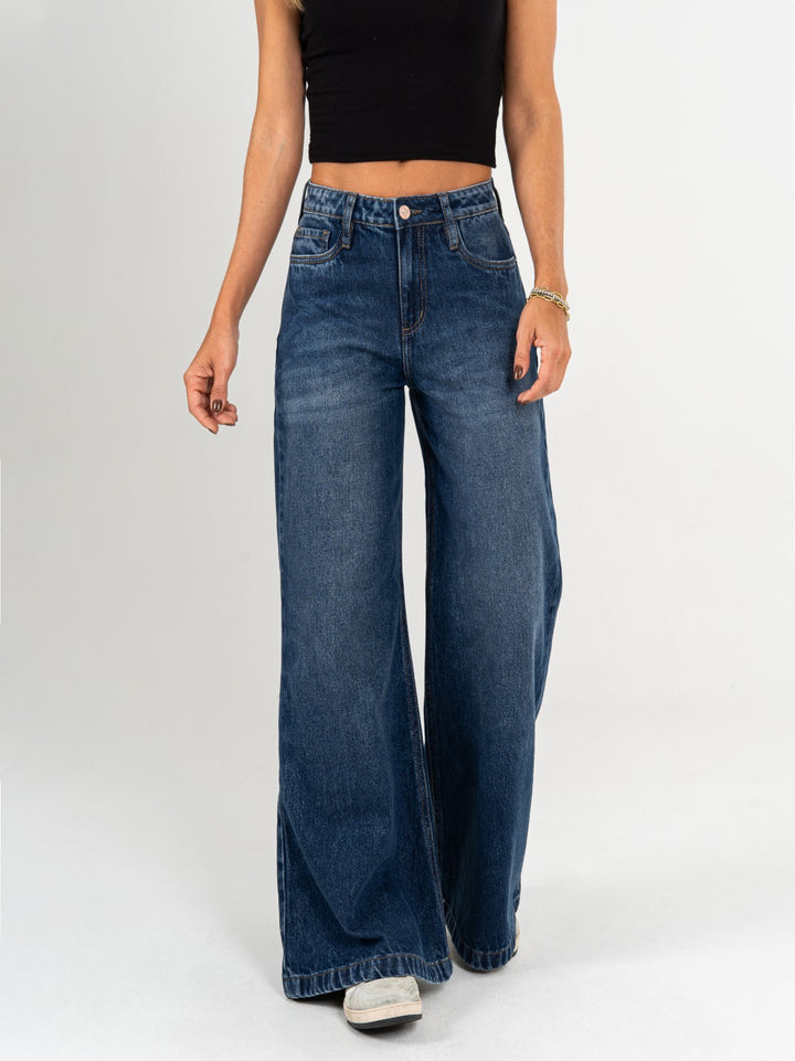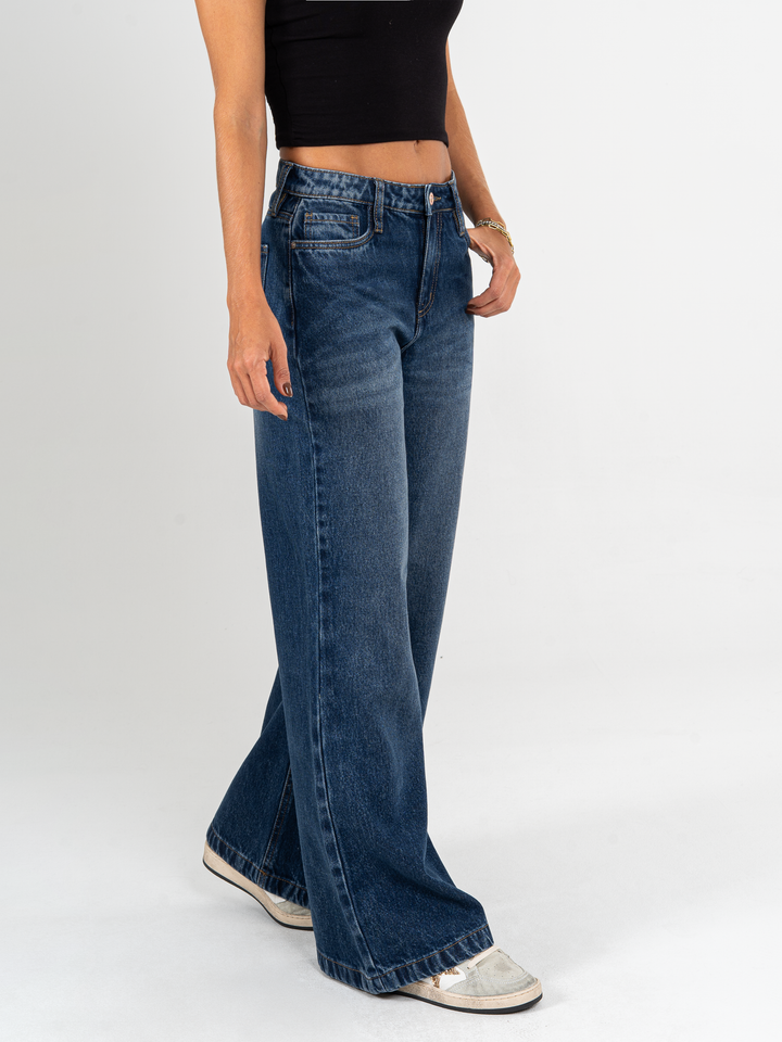 Jean palazzo, rígido, tiro medio, tono azul oscuro, cintura ajustada pierna holgada, diseño cinco bolsillos.