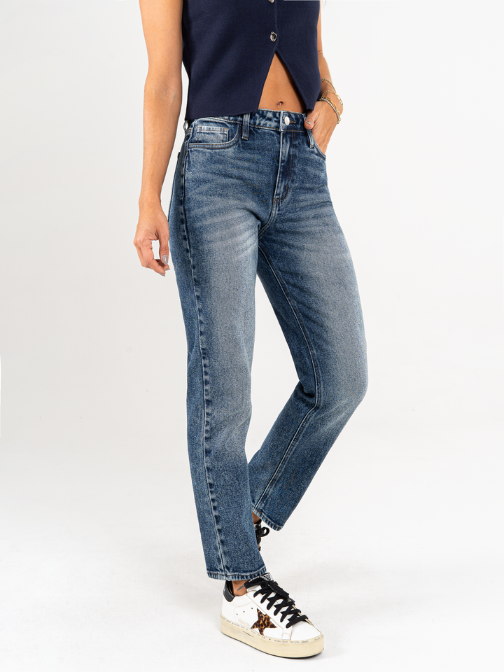 Ref: 065460 Jean straight leg, rígido, tiro alto, detalle en pretina, tono azul medio