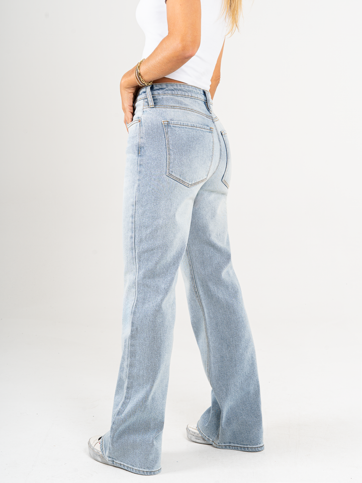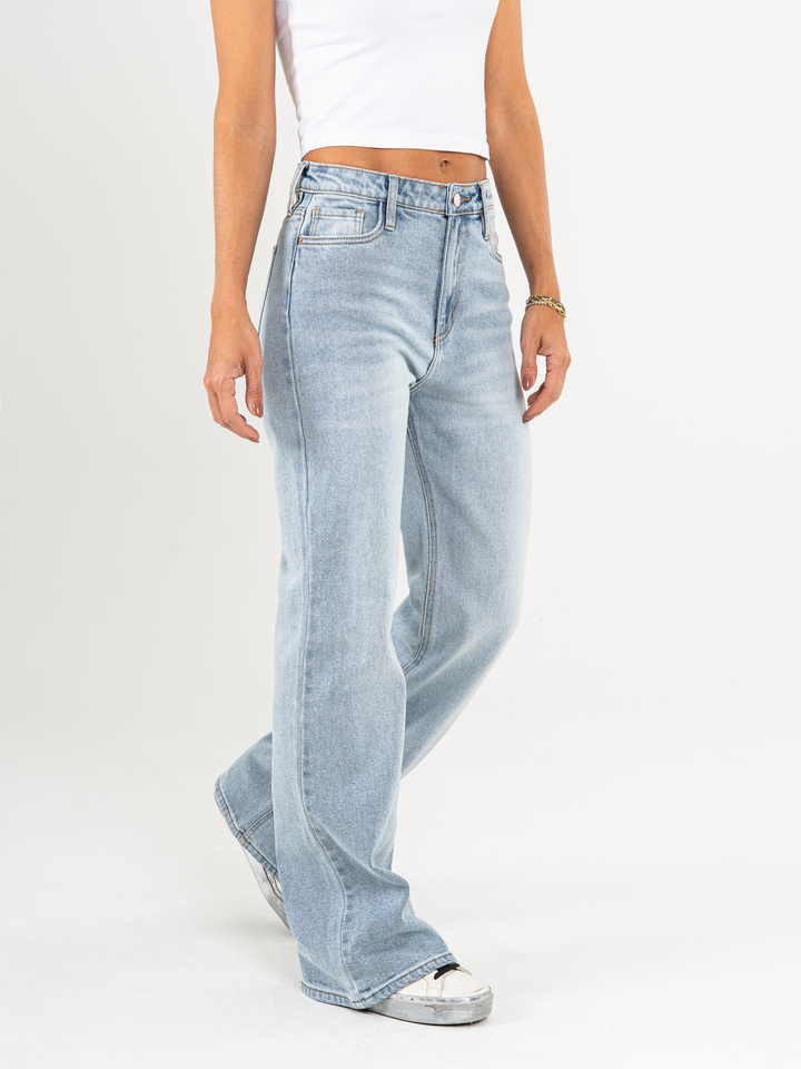 Jean Mom flare, stretch, tiro alto, tono azul medio claro, cintura ajustada pierna holgada, diseño cinco bolsillos.