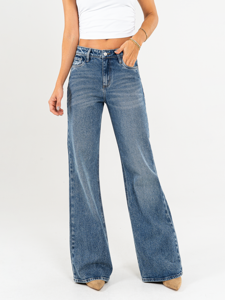 Ref: 065436 Jean flare stretch, bota ancha, tiro medio, tono azul medio