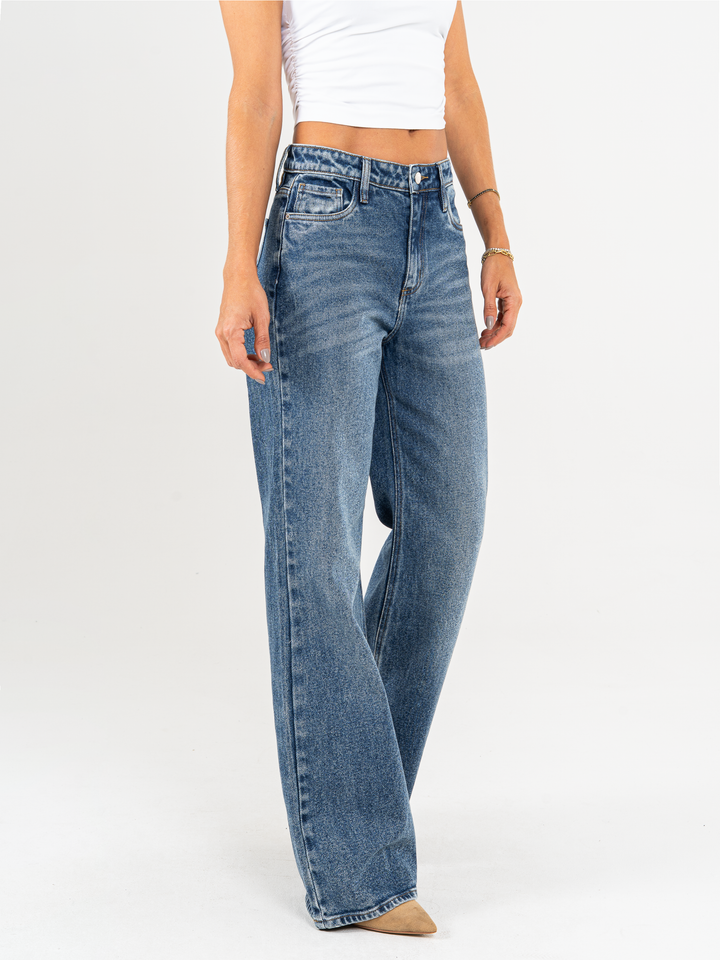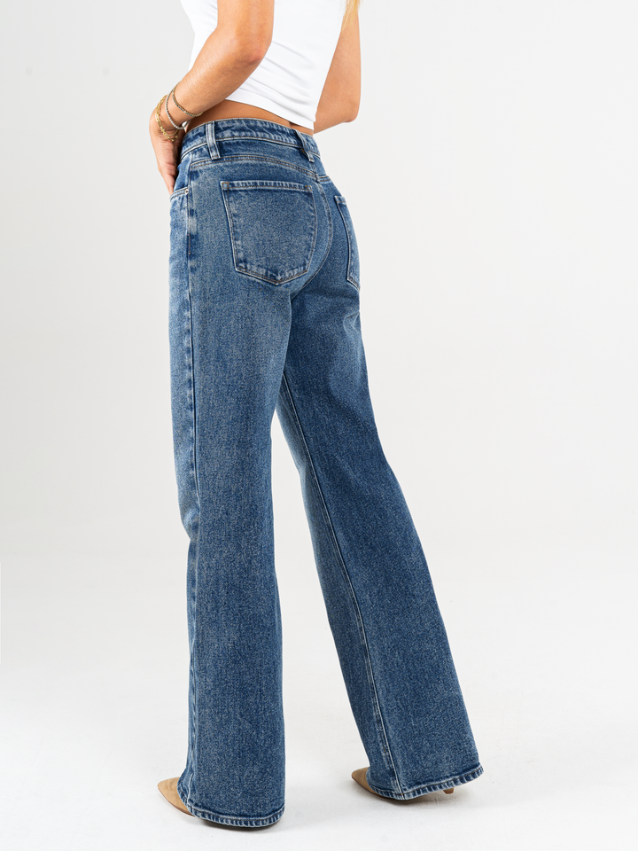 Jean palazzo, stretch, tiro alto, tono azul medio oscuro, cintura ajustada pierna holgada, diseño cinco bolsillos.