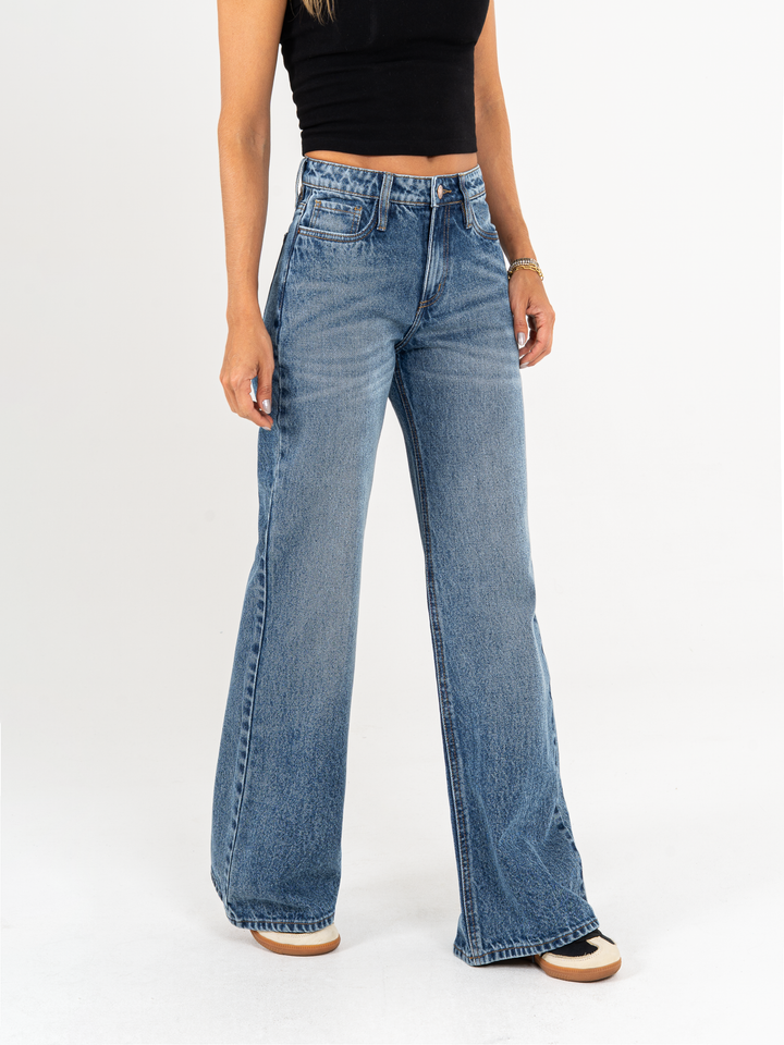 Ref: 065436 Jean flare stretch, bota ancha, tiro medio, tono azul medio