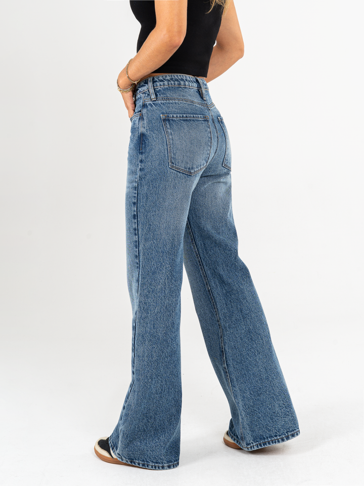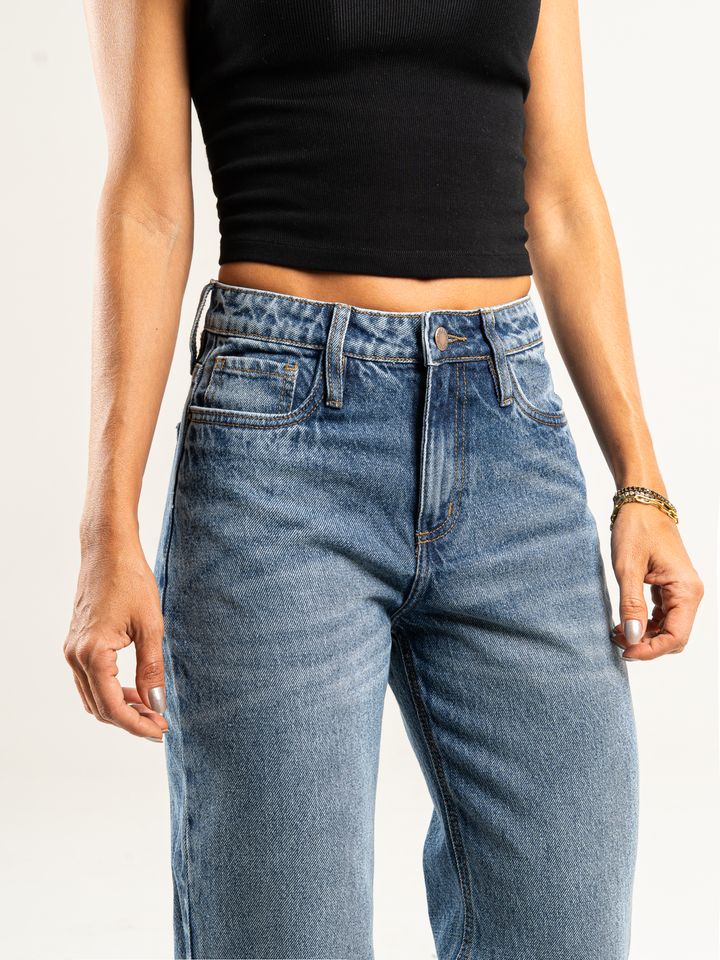 Jean Mom flare, rígido, tiro medio, tono azul medio, cintura ajustada pierna holgada, diseño cinco bolsillos.