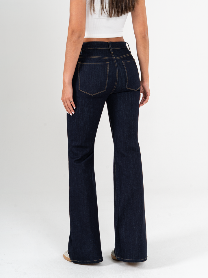 Jean flare stretch, bota ancha, tiro alto, tono azul oscuro, silueta ajustada, diseño cinco bolsillos.
