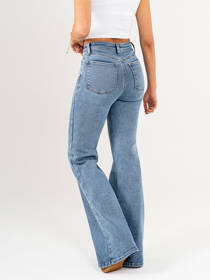 Jean flare stretch, bota ancha, tiro alto, tono azul medio claro, silueta ajustada, diseño cinco bolsillos.