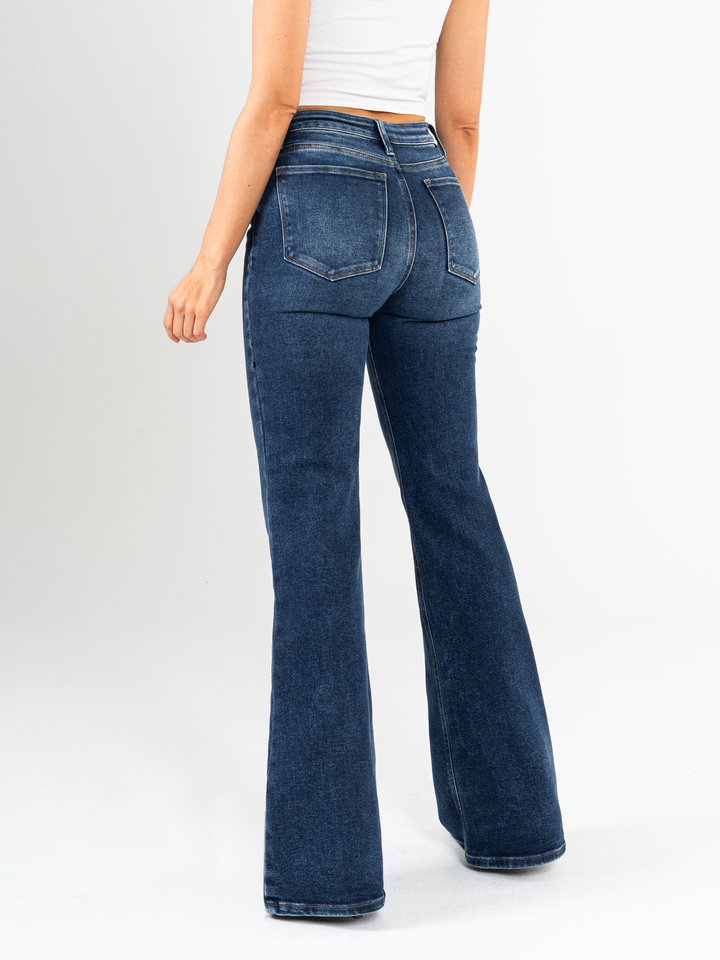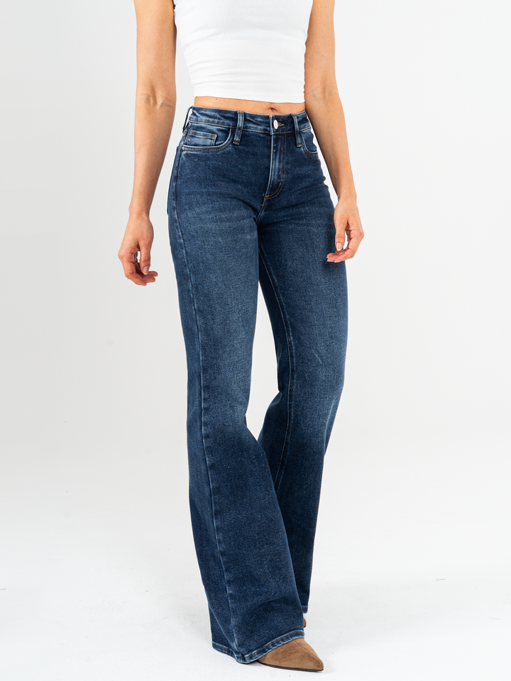 Jean flare stretch, bota ancha, tiro alto, tono azul medio, silueta ajustada, diseño cinco bolsillos.