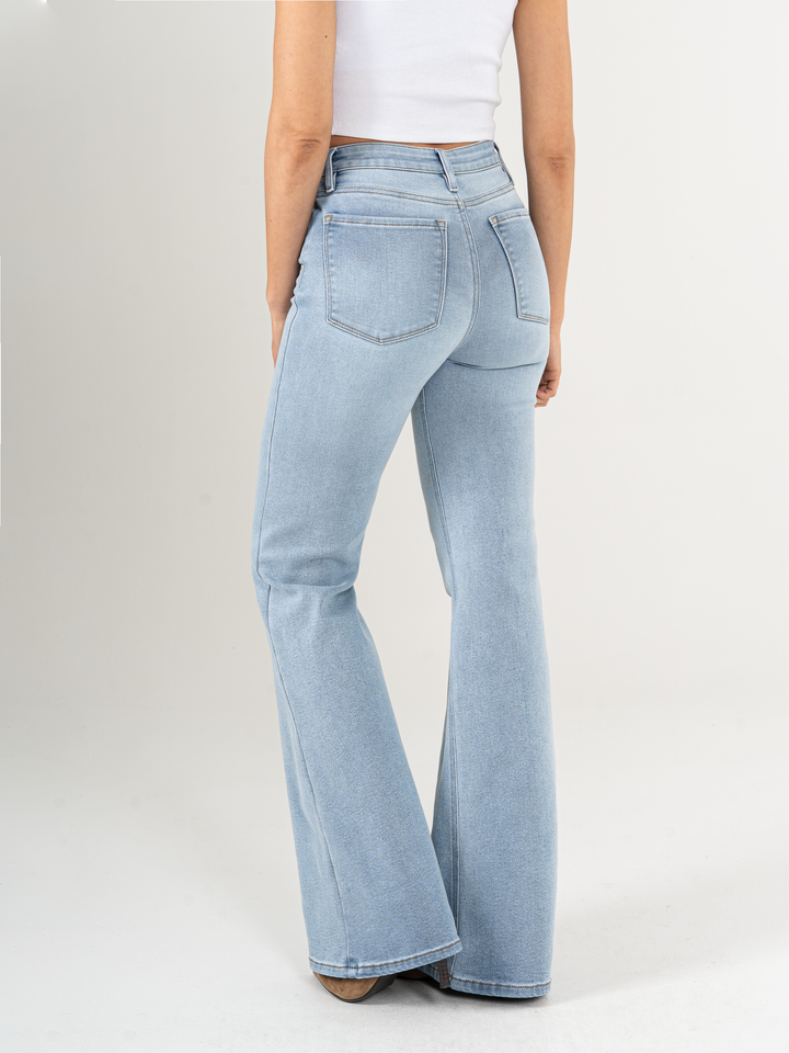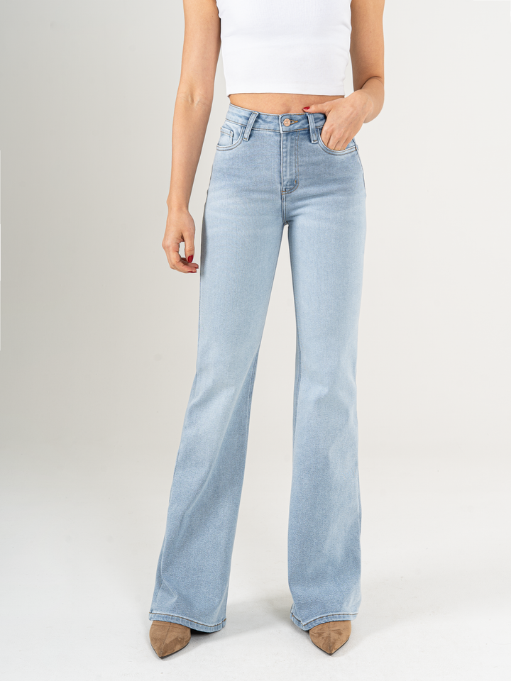 Jean flare stretch, bota ancha, tiro alto, tono azul claro, silueta ajustada, diseño cinco bolsillos.