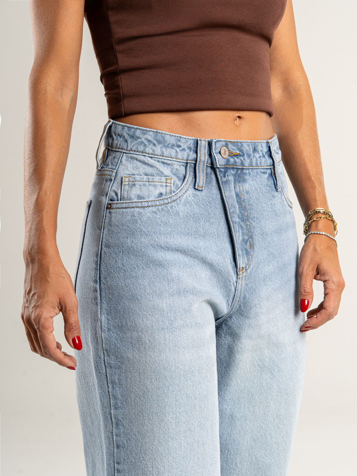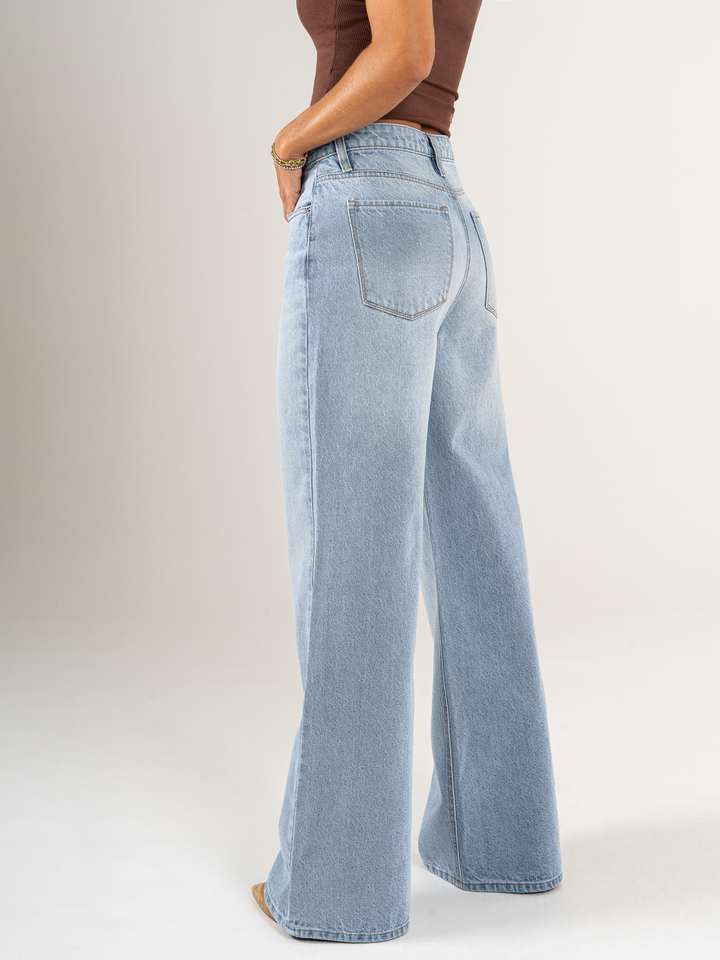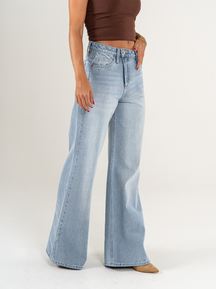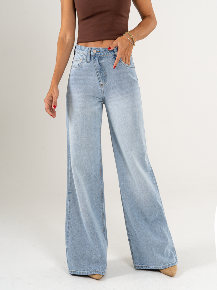 Jean palazzo, rígido, detalle en pretina, tiro alto, tono azul medio claro, diseño 5 bolsillos, cintura ajustada y pierna holgada.