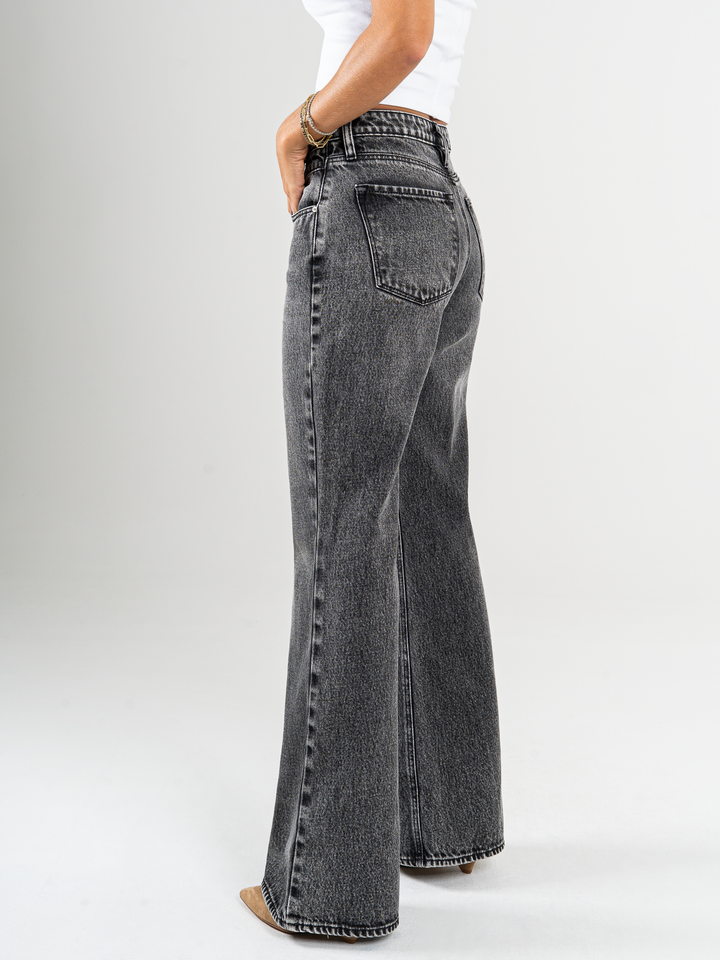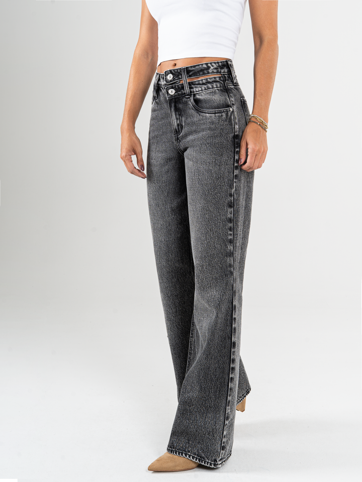 Jean palazzo, rígido, tiro alto, detalle en pretina, tono gris medio, cintura ajustada pierna holgada, diseño cinco bolsillos.