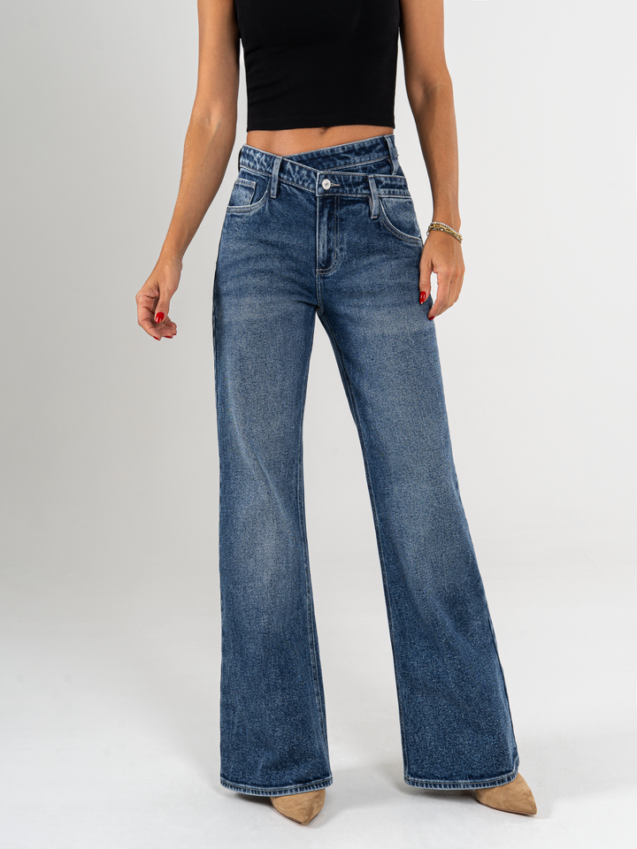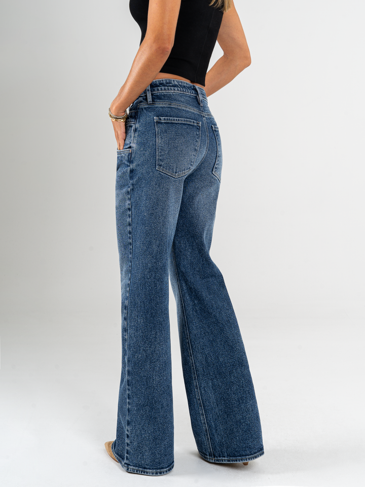 Ref: 065771 Jean Mom Flare, stretch, tiro alto, tono azul oscuro, detalle en pretina