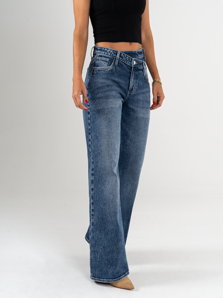 Ref: 065321 Jean palazzo, rígido, cortes en pierna, tiro alto, tono azul oscuro, detalle en cintura
