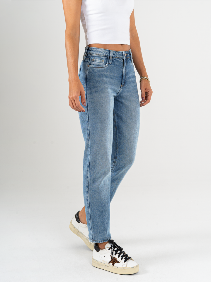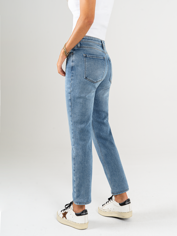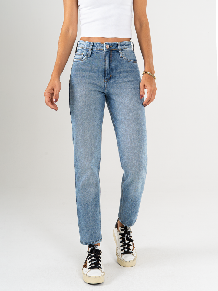 Jean Mom fit, slim cropped, stretch, tiro alto, tono azul medio claro, cintura ajustada pierna holgada, diseño cinco bolsillos.