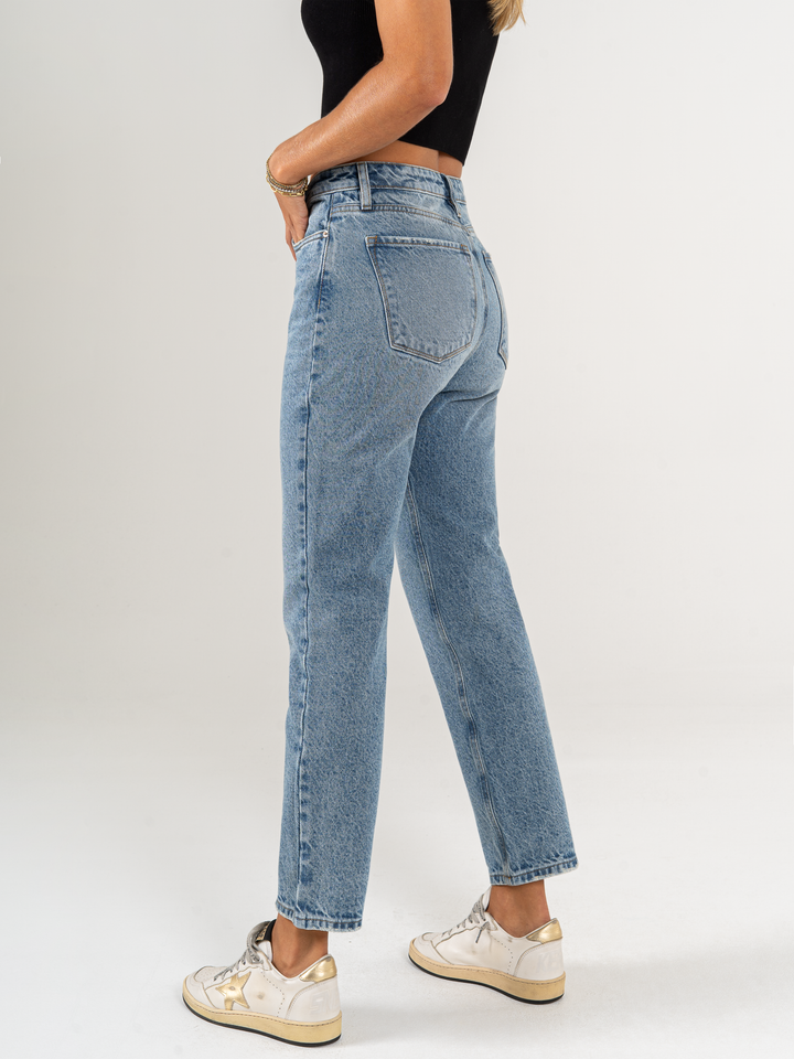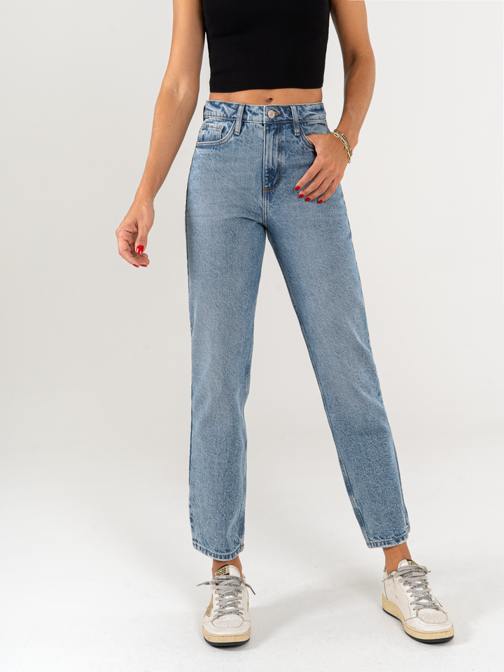 Jean Mom fit, rígido, tiro alto, tono azul medio claro, cintura ajustada pierna holgada, diseño cinco bolsillos.