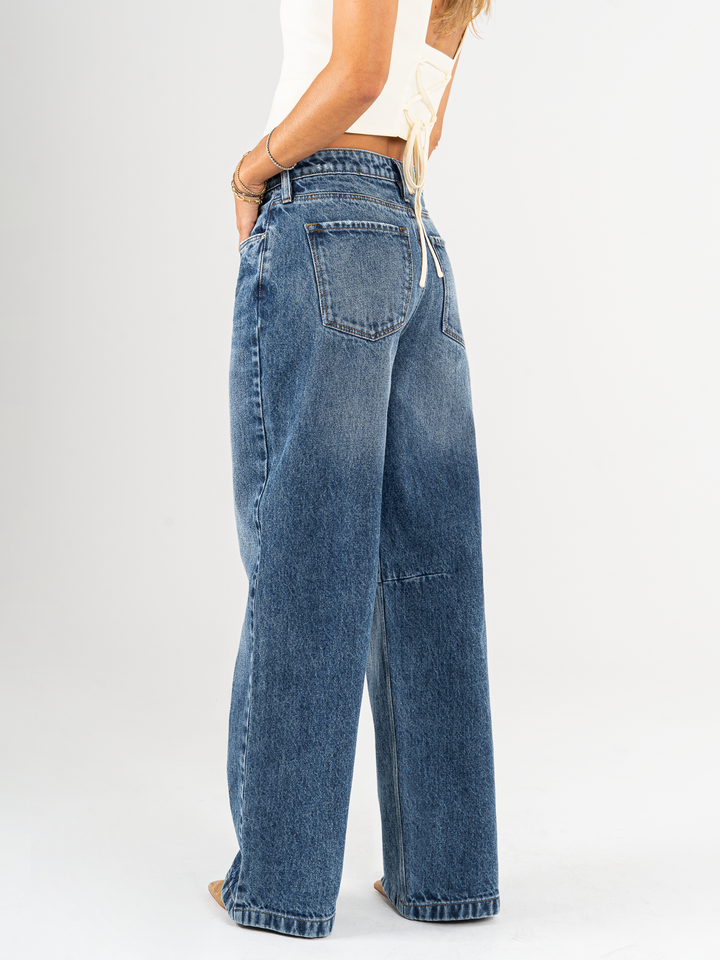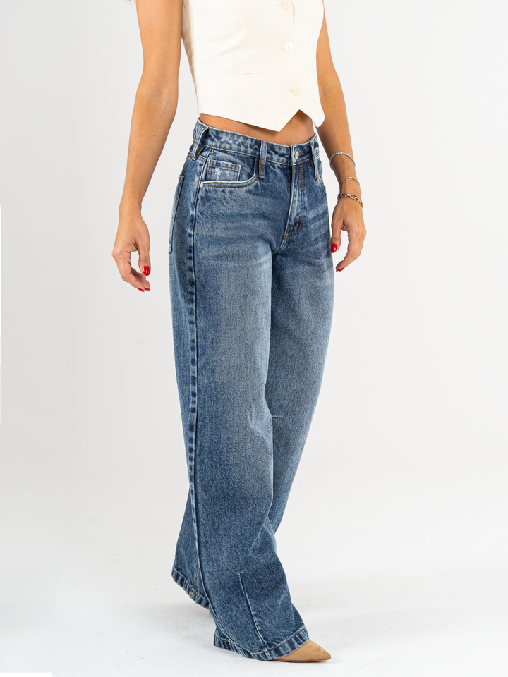 Jean wide leg, tiro medio, rígido,  tono azul oscuro, diseño 5 bolsillos, cintura ajustada y silueta amplia de pierna recta.