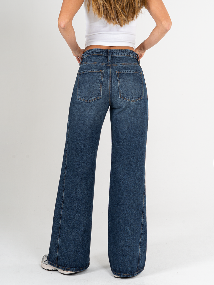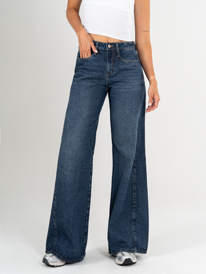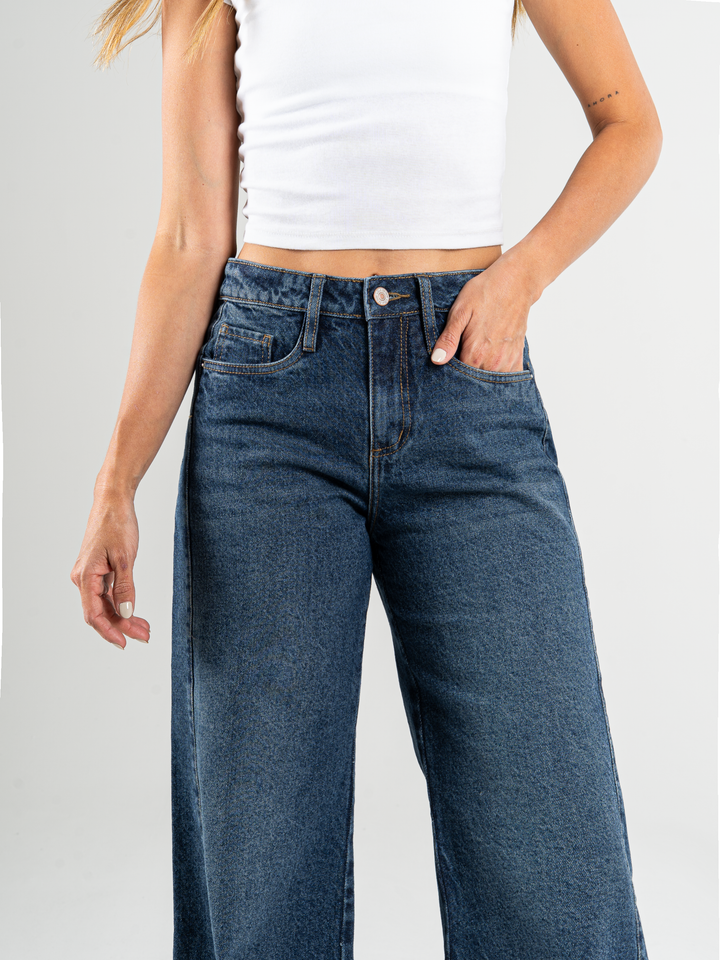 Jean palazzo, rígido, tiro medio, con cortes, tono azul oscuro, diseño cinco bolsillos, cintura ajustada, pierna holgada.