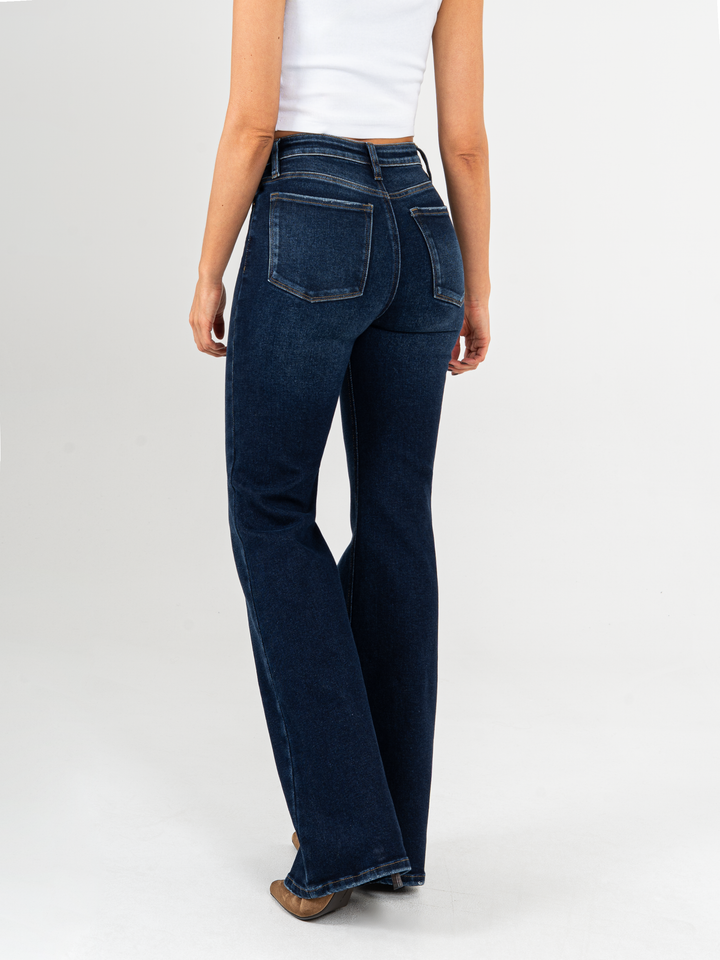 Jean flare stretch, bota ancha, tiro alto, tono azul oscuro, silueta ajustada, diseño cinco bolsillos.