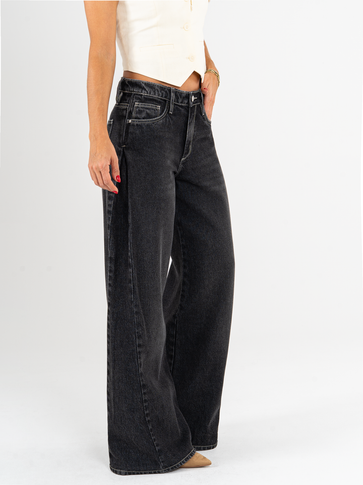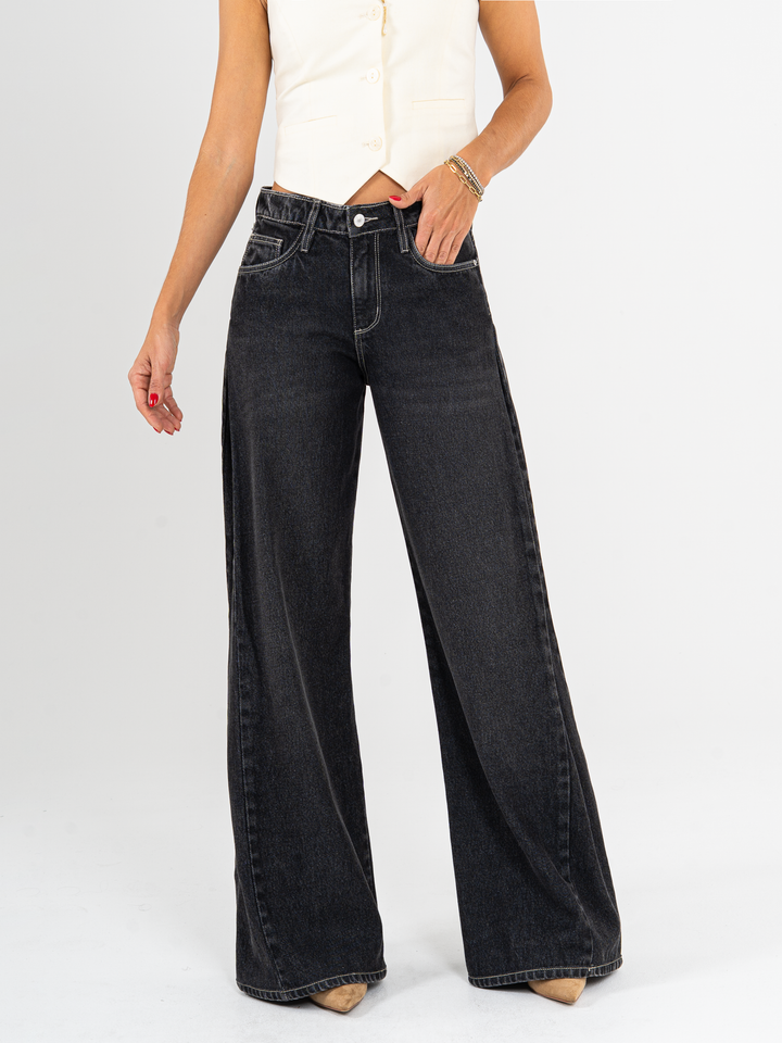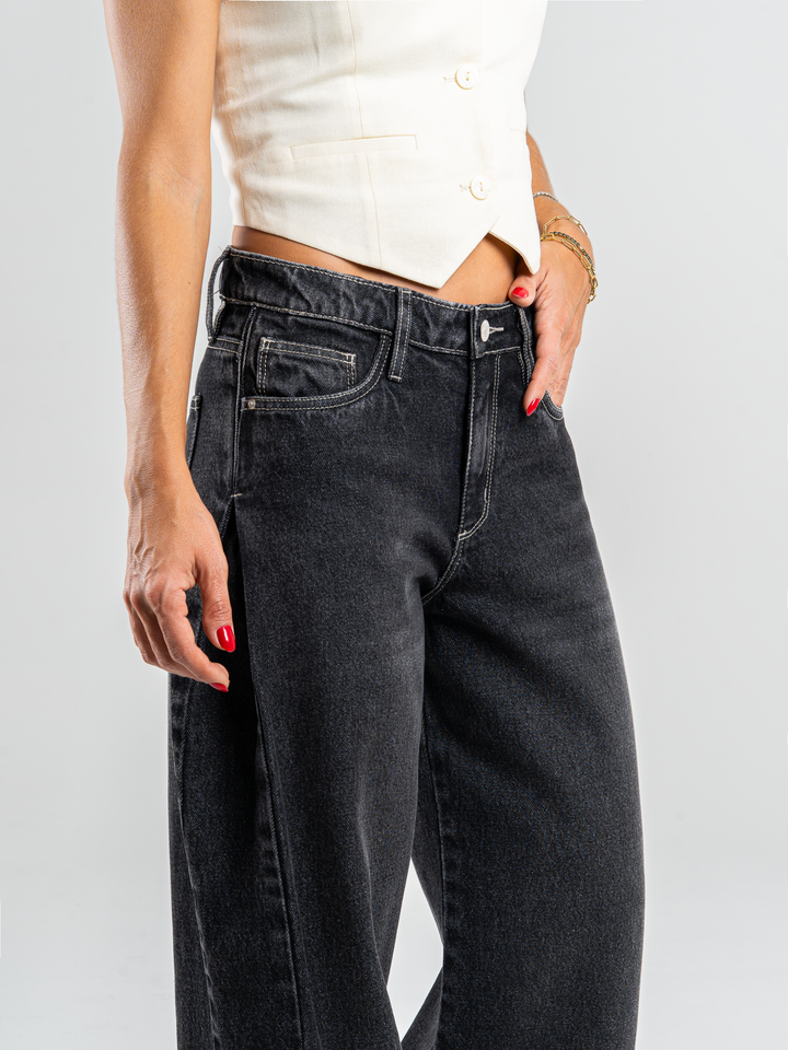 Jean palazzo, rígido, tiro alto, corte en costado, tono gris medio, cintura ajustada pierna holgada, diseño cinco bolsillos.
