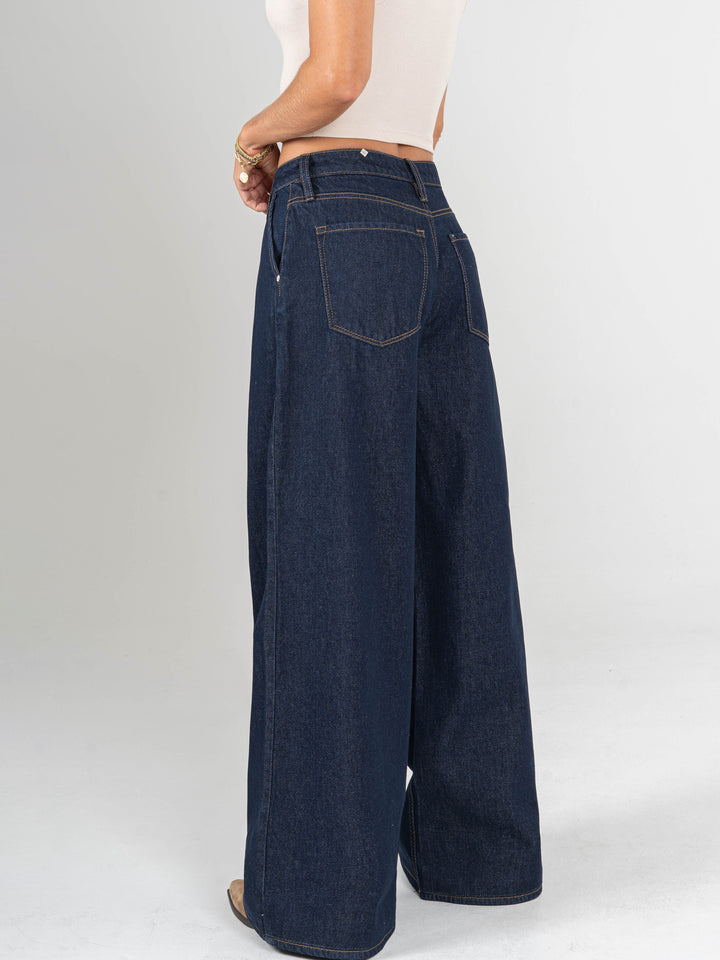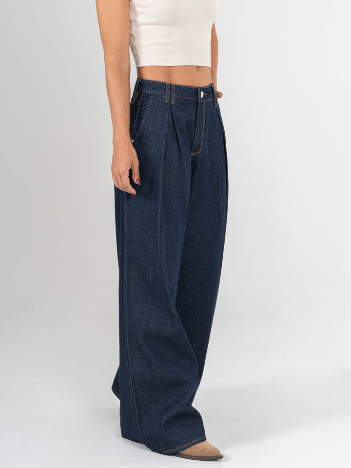 Jean palazzo, rígido, tono azul oscuro, cintura ajustada pierna holgada, bolsillo diagonal.