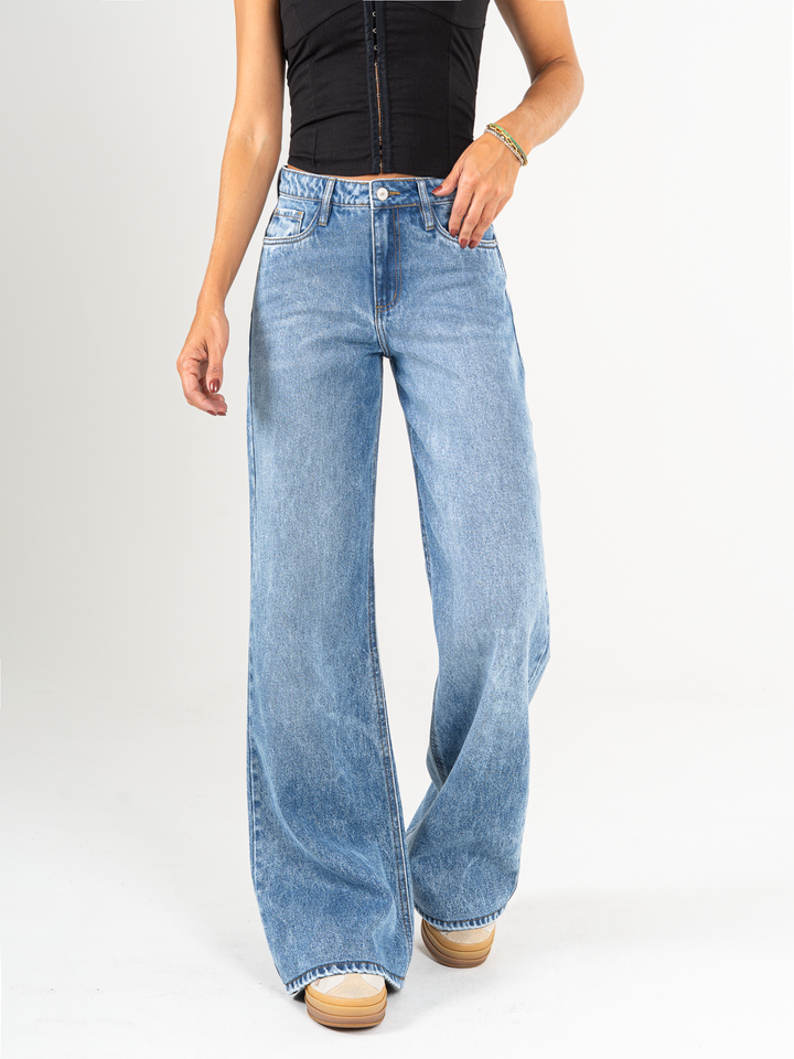 Ref: 065436 Jean flare stretch, bota ancha, tiro medio, tono azul medio