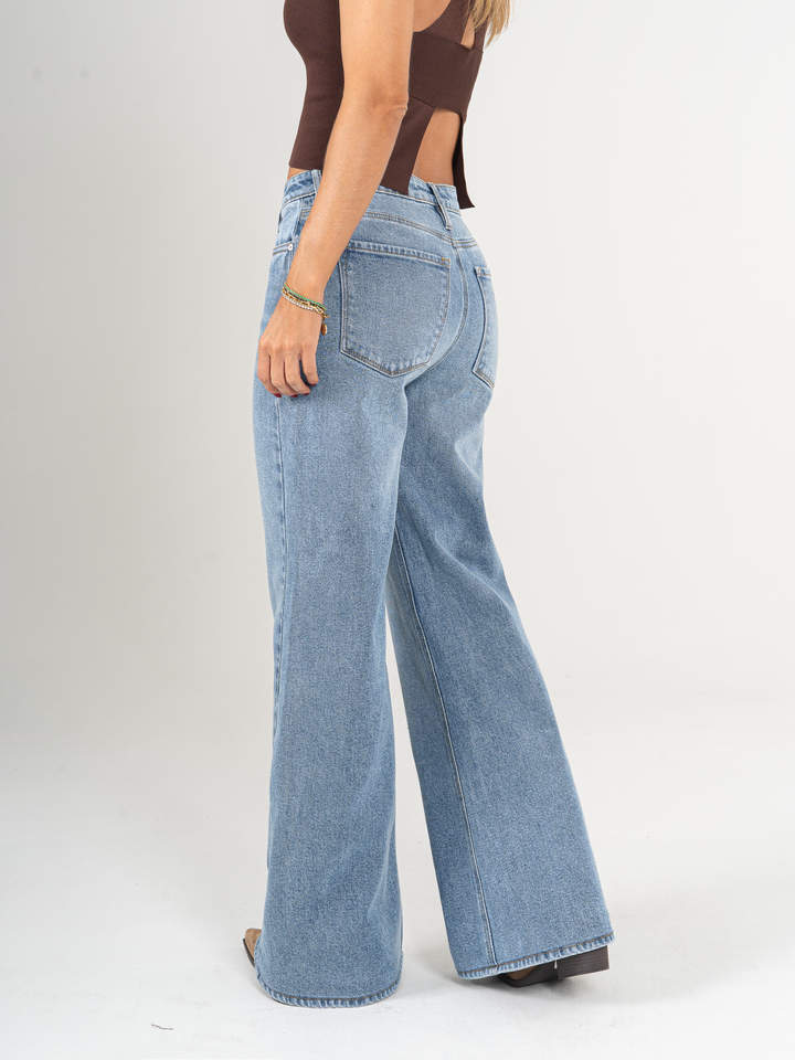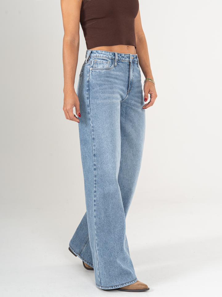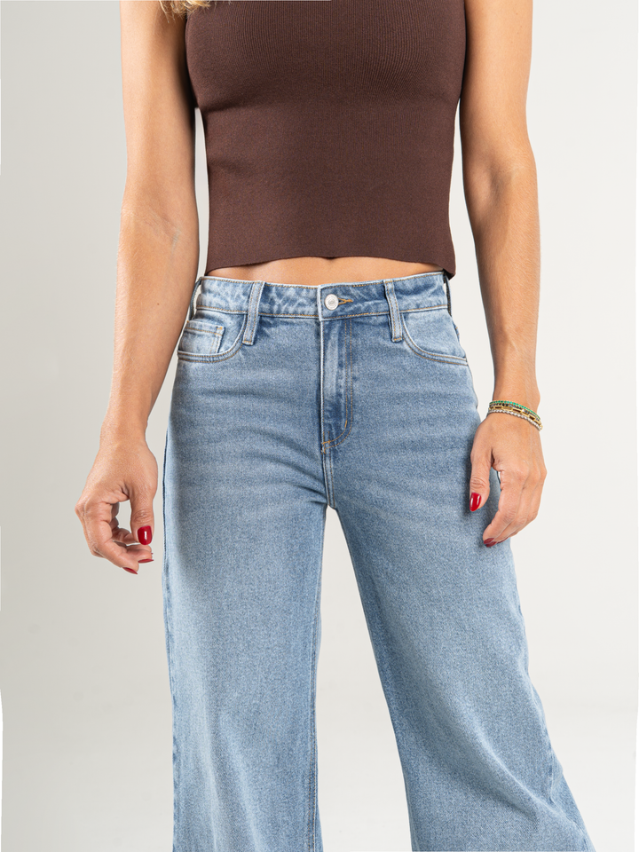 Jean palazzo, stretch, tiro alto, tono azul medio, cintura ajustada pierna holgada, diseño cinco bolsillos.