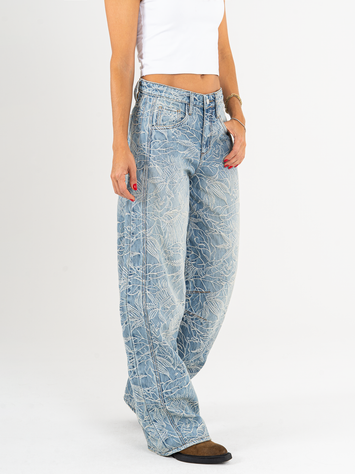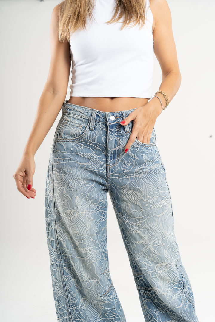 Jean wide leg, tiro alto,  detalle de tela bordada, rígido, tono azul medio, diseño 5 bolsillos, cintura ajustada y silueta amplia de pierna recta.