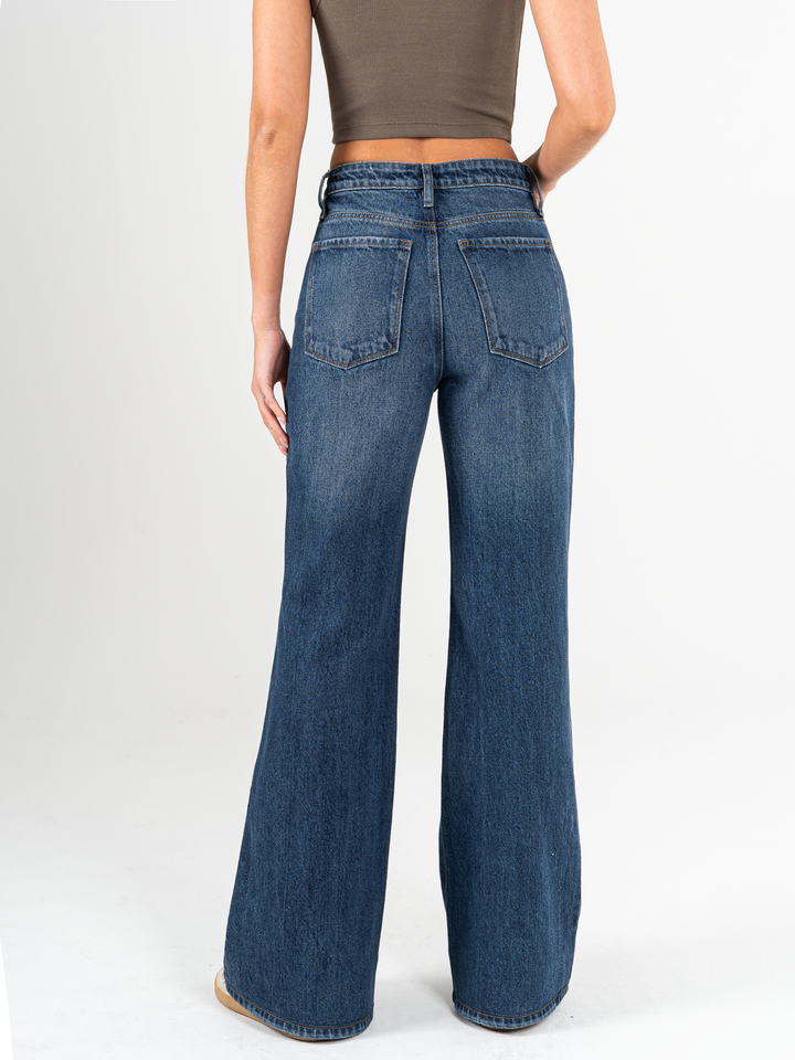 Ref: 065889 Jean flare stretch, bota ancha, tiro alto, tono azul oscuro
