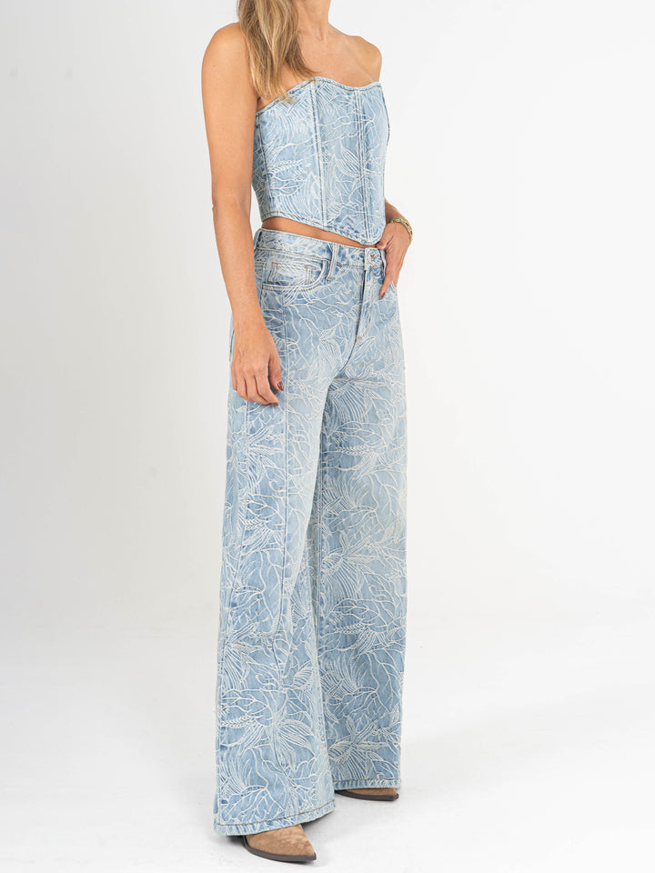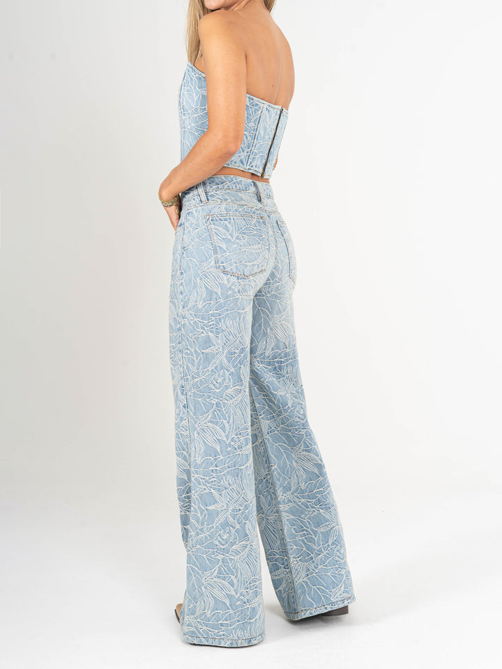 Jean wide leg, tiro medio, detalle de tela bordada, rígido, tono azul medio, diseño 5 bolsillos,  cintura ajustada y pierna holgada.