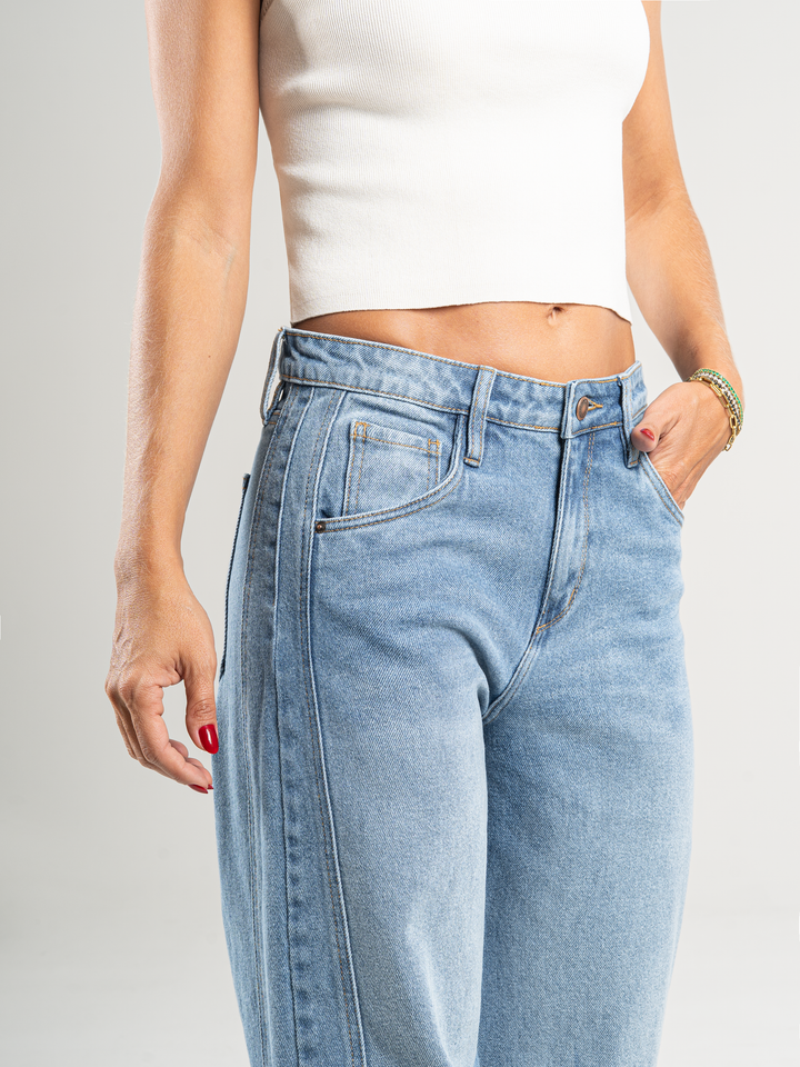 Jean wide leg, tiro alto, stretch, con cortes ,tono azul claro, diseño 5 bolsillos, cintura ajustada y silueta amplia de pierna recta.