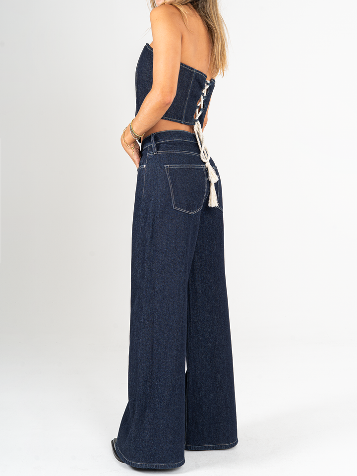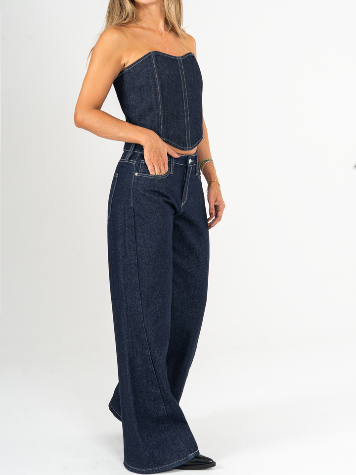 Jean palazzo, rígido, tiro alto, tono azul oscuro, cintura ajustada pierna holgada, bolsillo ribete.