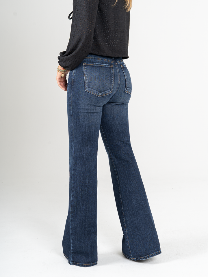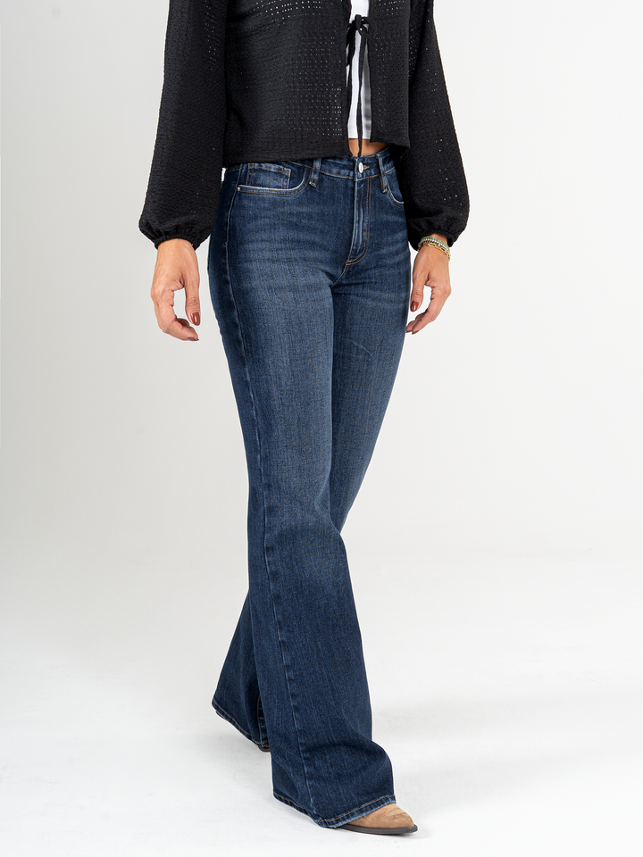 Jean flare stretch, bota ancha, tiro medio, tono azul oscuro, silueta ajustada, diseño cinco bolsillos.