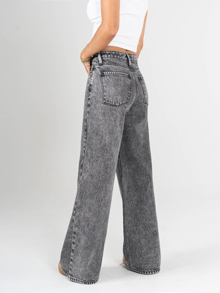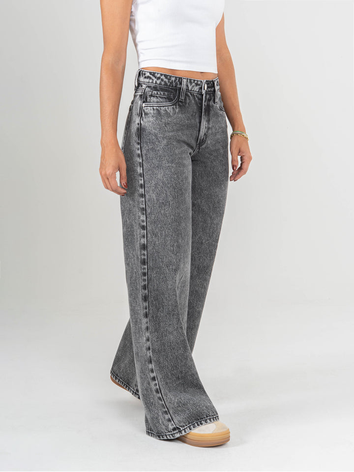 Jean palazzo, rígido, tiro alto, tono gris medio, cintura ajustada pierna holgada, diseño cinco bolsillos.