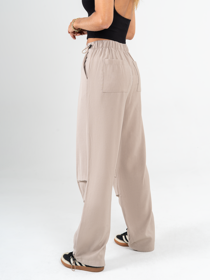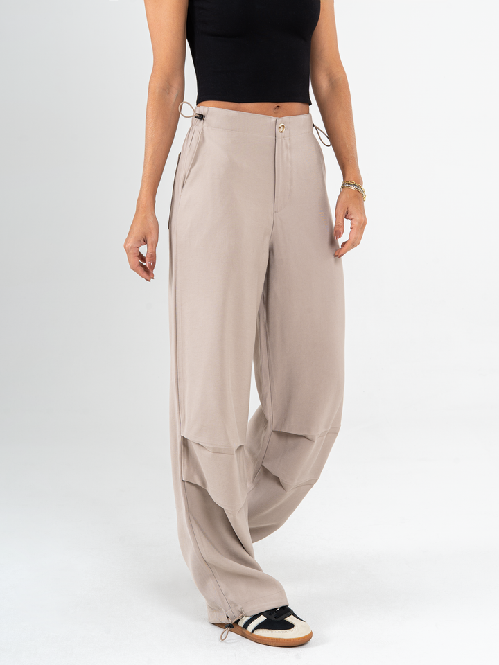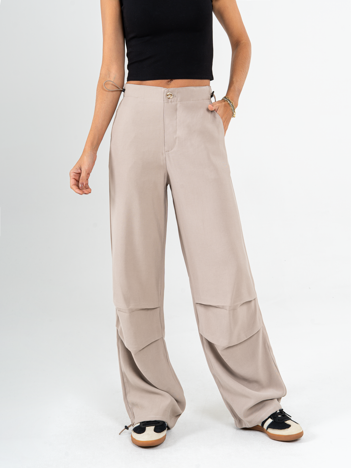 Pantalón cargo, straight leg, prense en pierna, tono caqui, detalle en pretina, tejido plano liviano, tiro alto, diseño con ajustador en bota, bolsillo diagonal, silueta amplia.