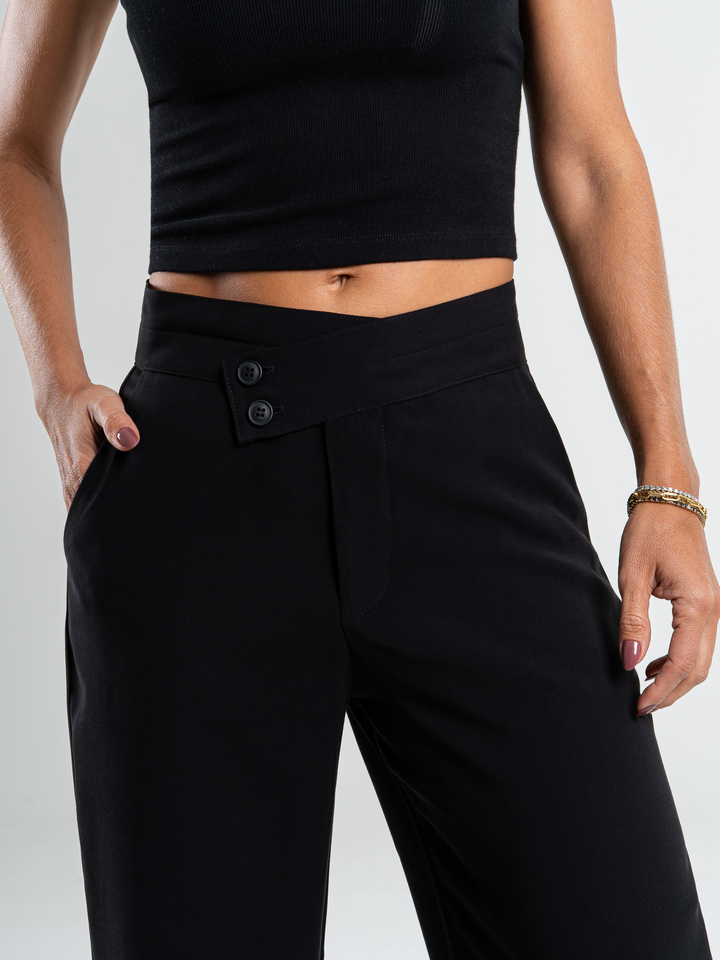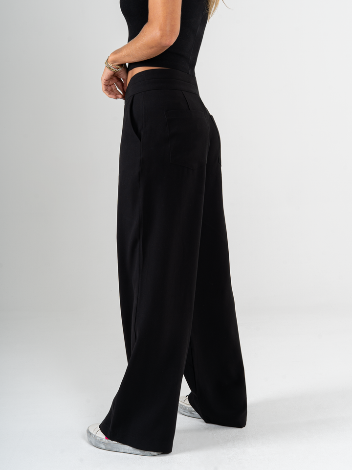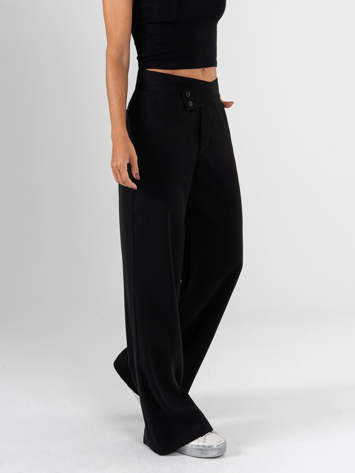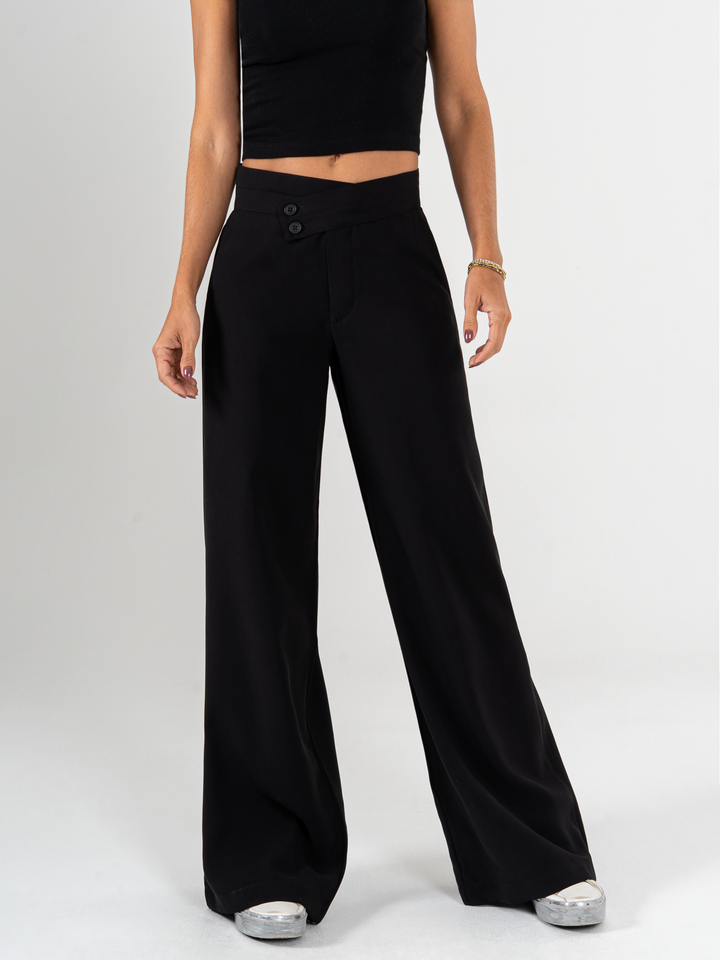 Pantalón palazzo, sin prenses, tejido plano liviano, detalle en pretina, tono negro, tiro alto, bolsillo al diagonal, silueta amplia.