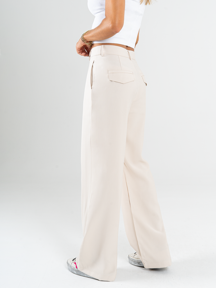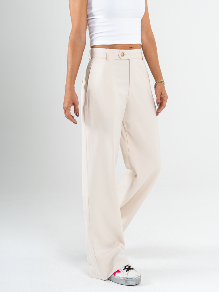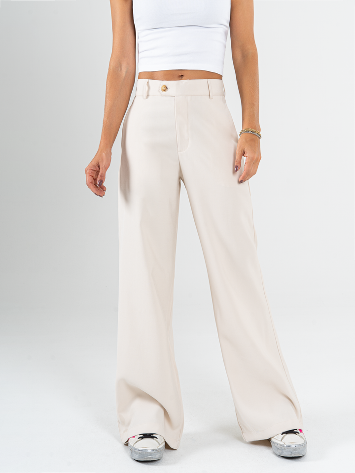 Ref: 069497 Pantalón straight leg, sin prense, tono ivory, tejido plano liviano, tiro alto, detalle en pretina