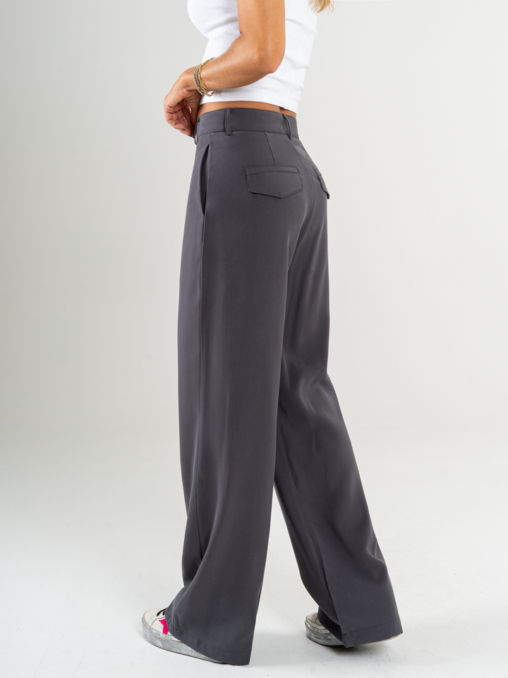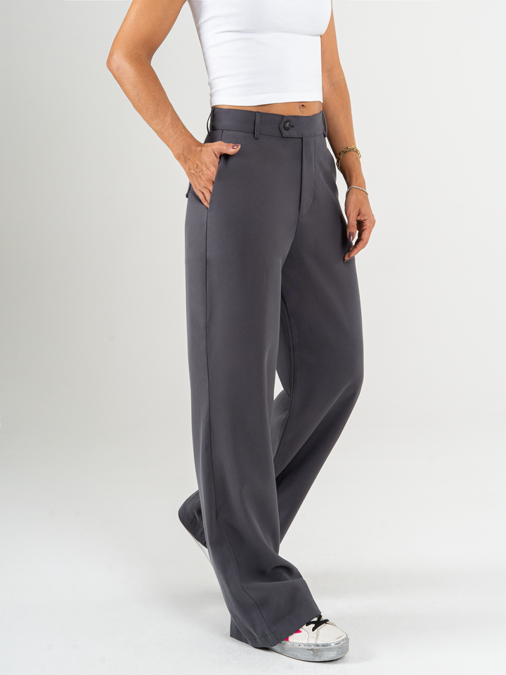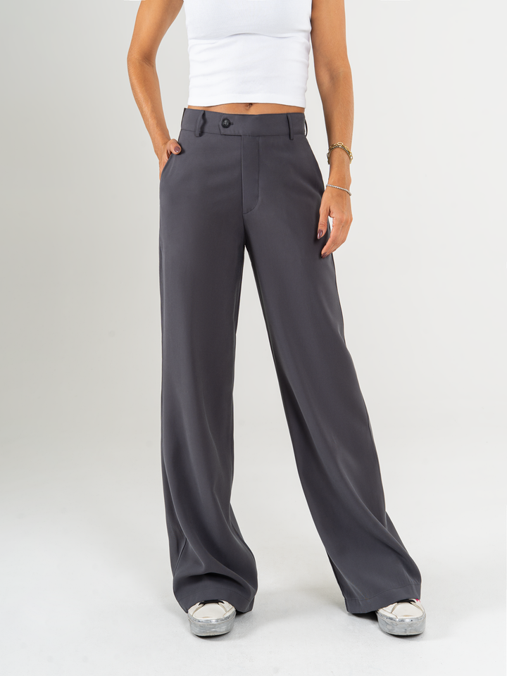 Ref: 069656 Pantalón straight leg, tiro alto, tejido plano liviano, detalle cierres, tono gris oscuro