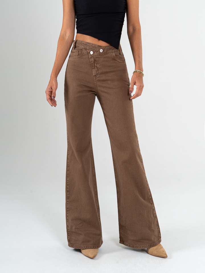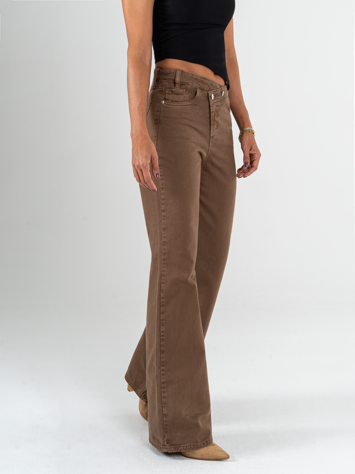 Ref: 069835 Pantalón mom Flare, rígido, tiro alto, detalle en pretina, tono café