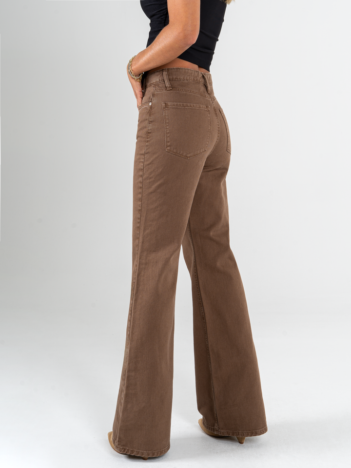 Pantalón mom Flare, rígido, tiro alto, detalle en pretina, tono café, diseño cinco bolsillos, cintura ajustada y pierna holgada.