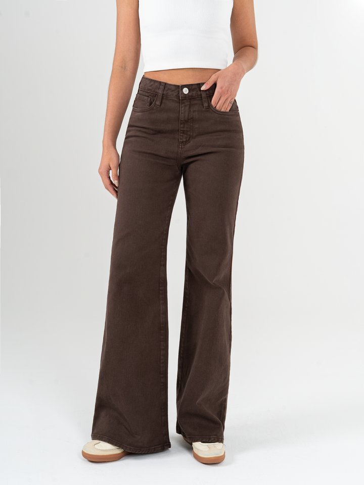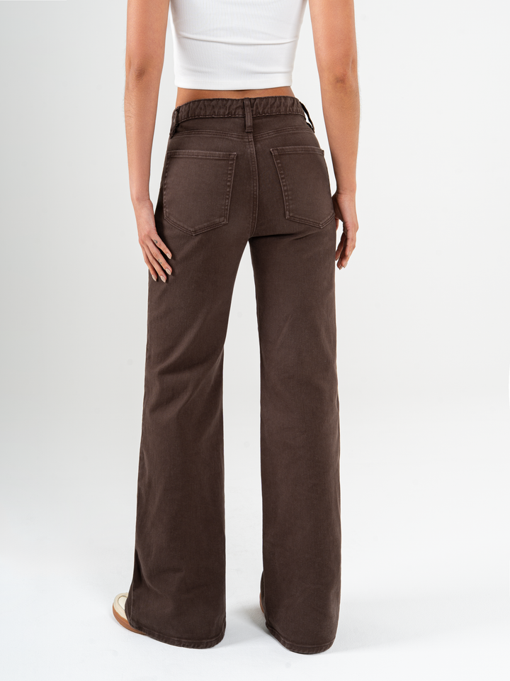 Pantalón palazo stretch, tiro alto, tono café, cintura ajustada, pierna holgada, diseño cinco bolsillos.