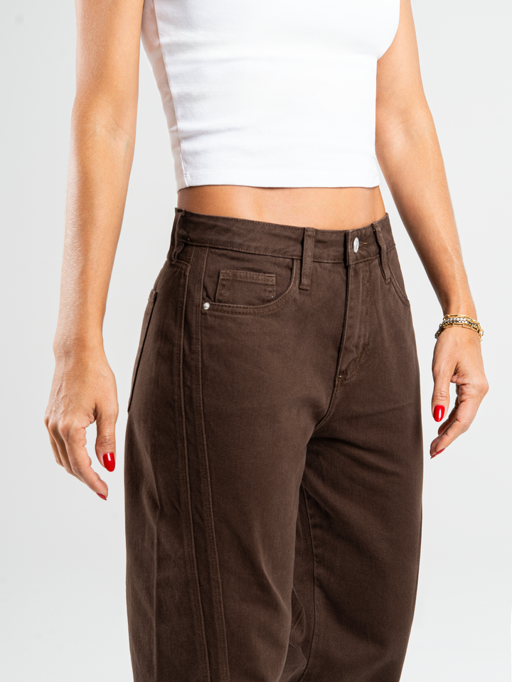 Ref: 069584 Pantalón barrel, rígido, cropped, tiro medio, diseño cinco bolsillos, tono cafe